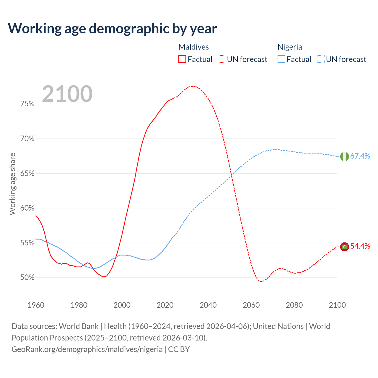 - Maldives has 403K working age adults (aged 15-64) vs 136M in Nigeria.