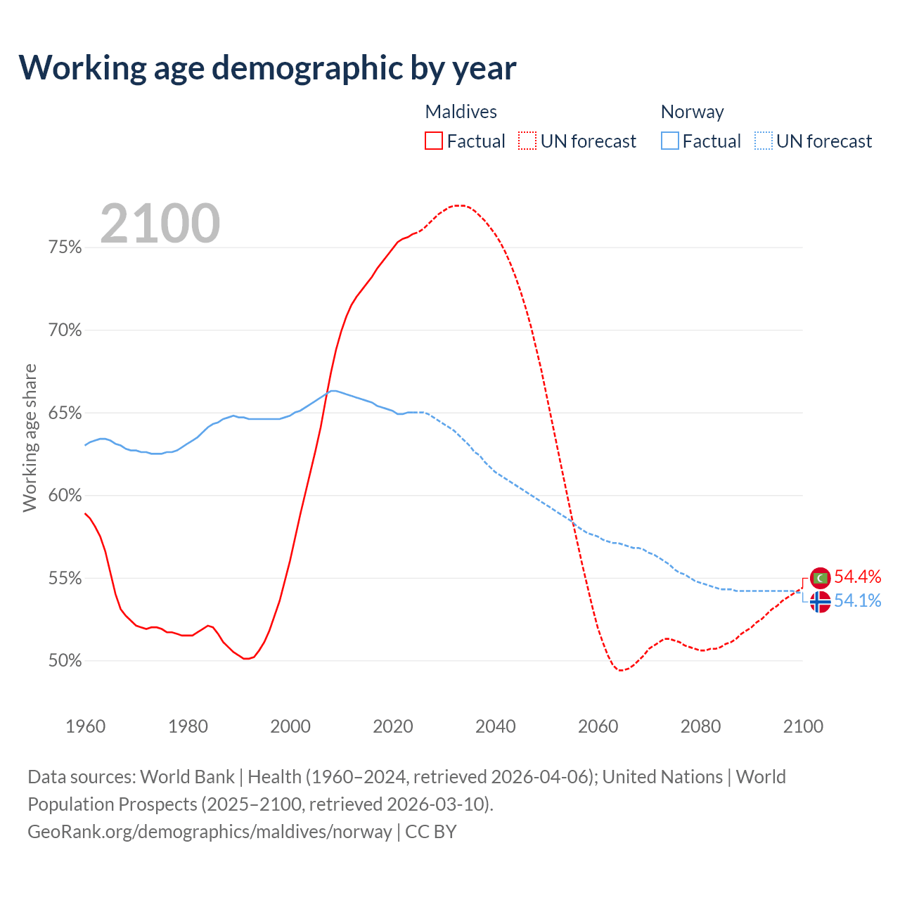 - Maldives has 403K working age adults (aged 15-64) vs 3.69M in Norway.