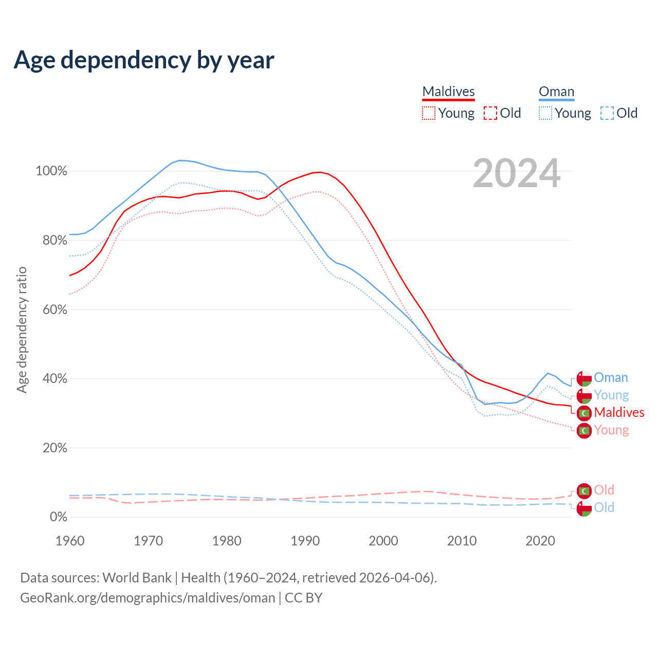 Data sources: World Bank | Health (1960–2024, retrieved 2026-04-06); U.S. Census Bureau (1960–2024, retrieved 2026-02-08).