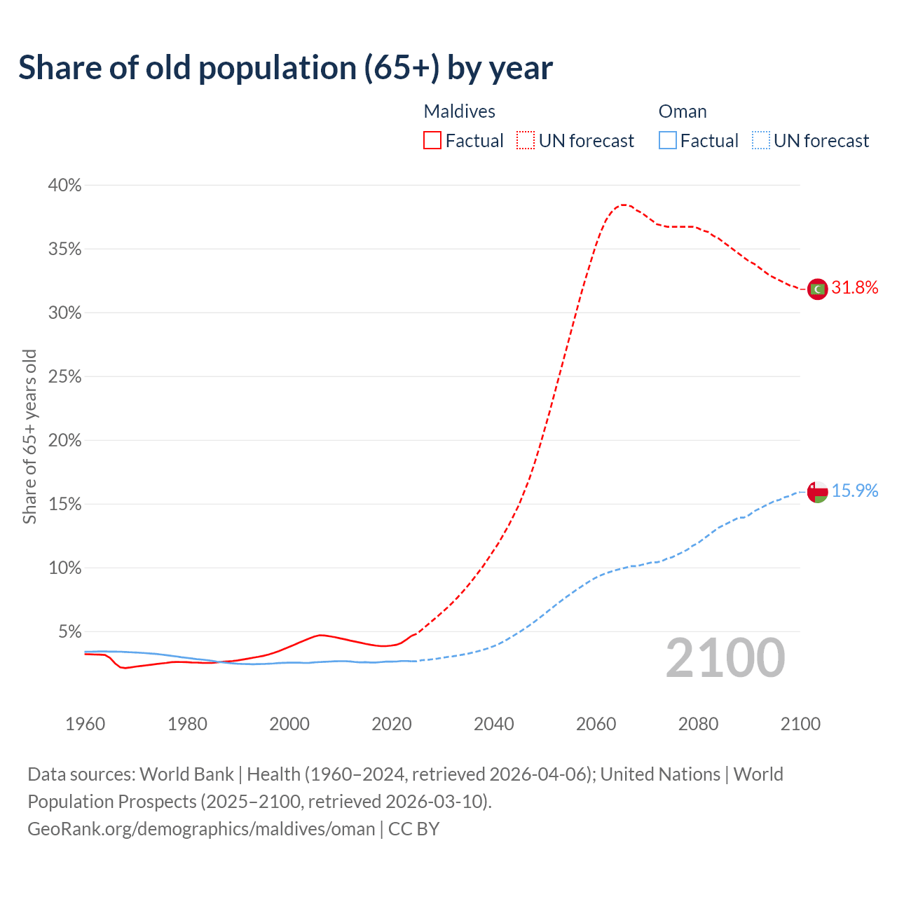 - The share of old-age demographic (65+) in Maldives is 4.64% vs 2.64% in Oman.