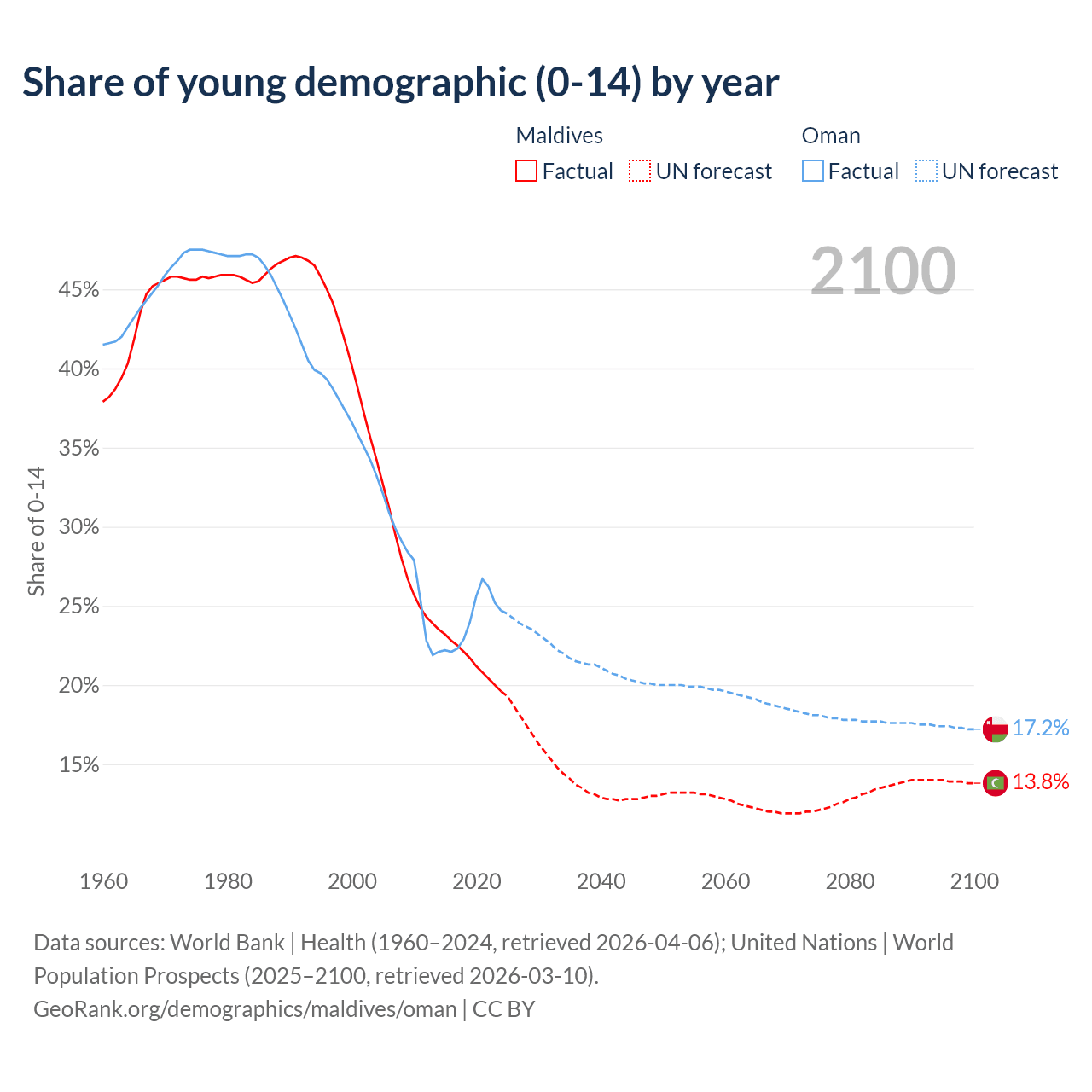 - The share of young demographic (0-15 years old) in Maldives is 19.6% vs 24.7% in Oman.