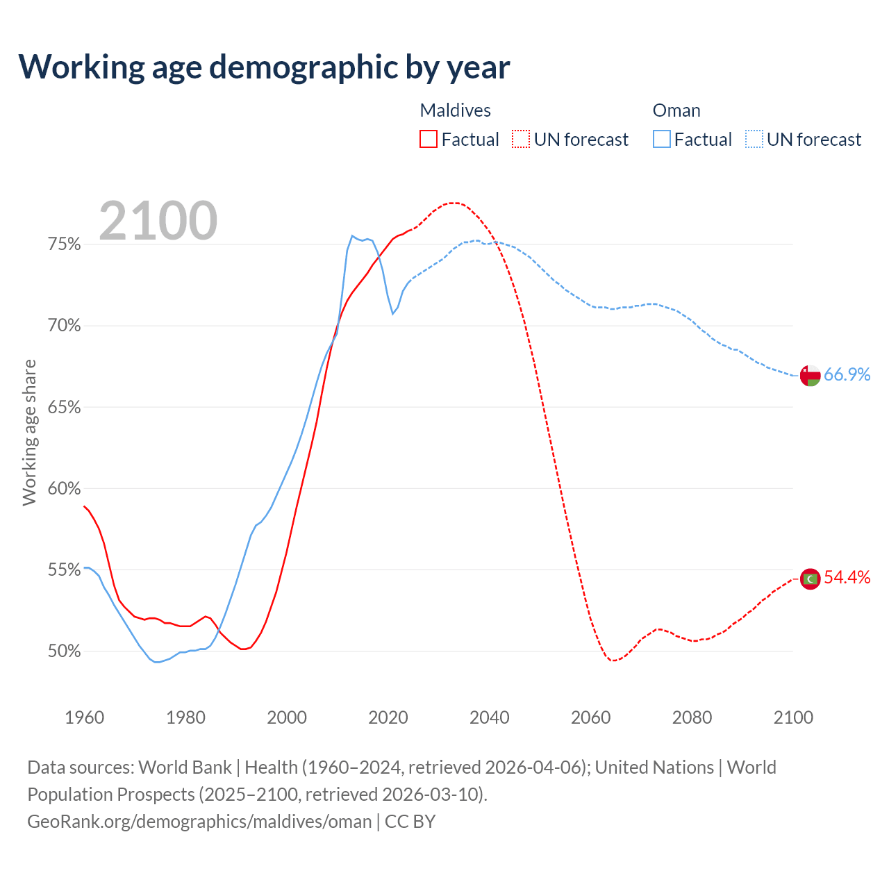 Median age Maldives vs Oman, 1960-2100