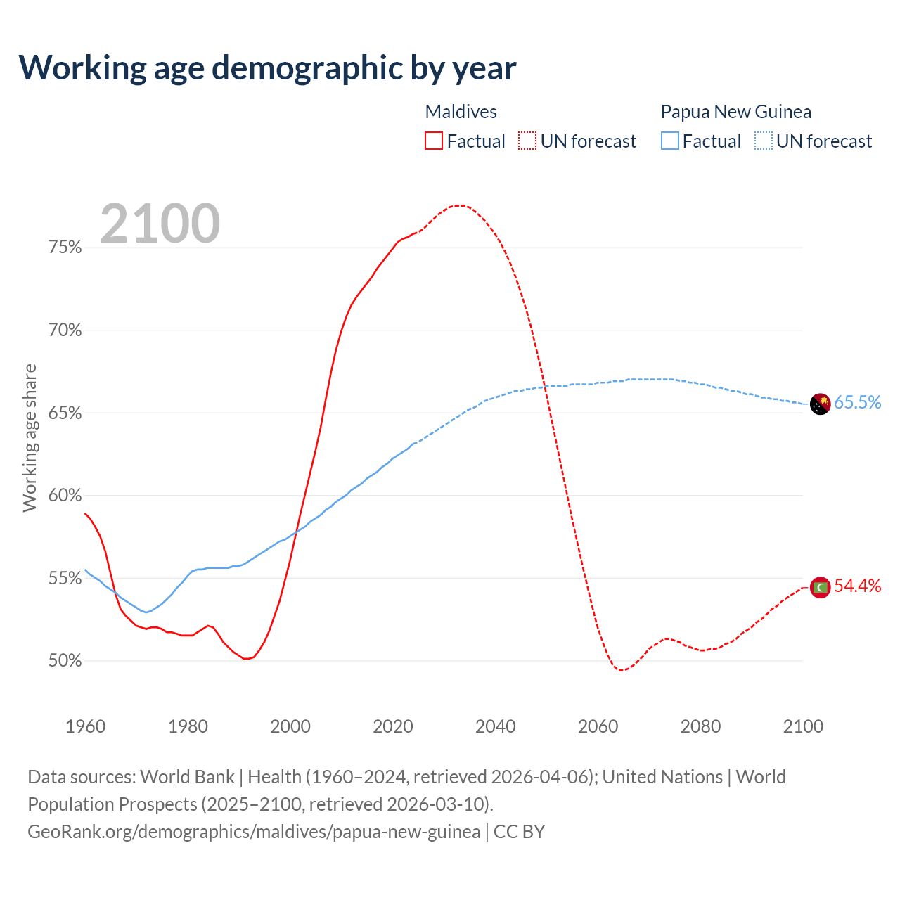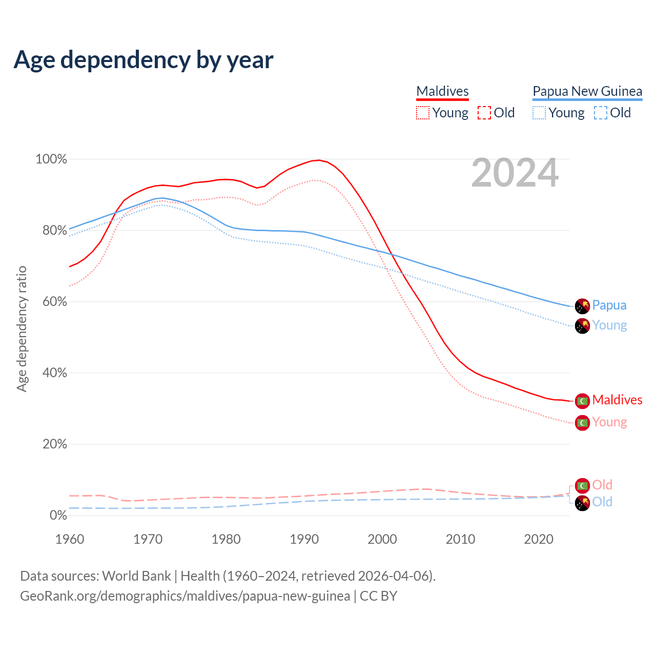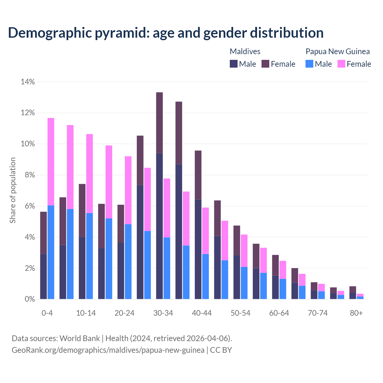 - The share of old-age demographic (65+) in Maldives is 4.64% vs 3.46% in Papua New Guinea.