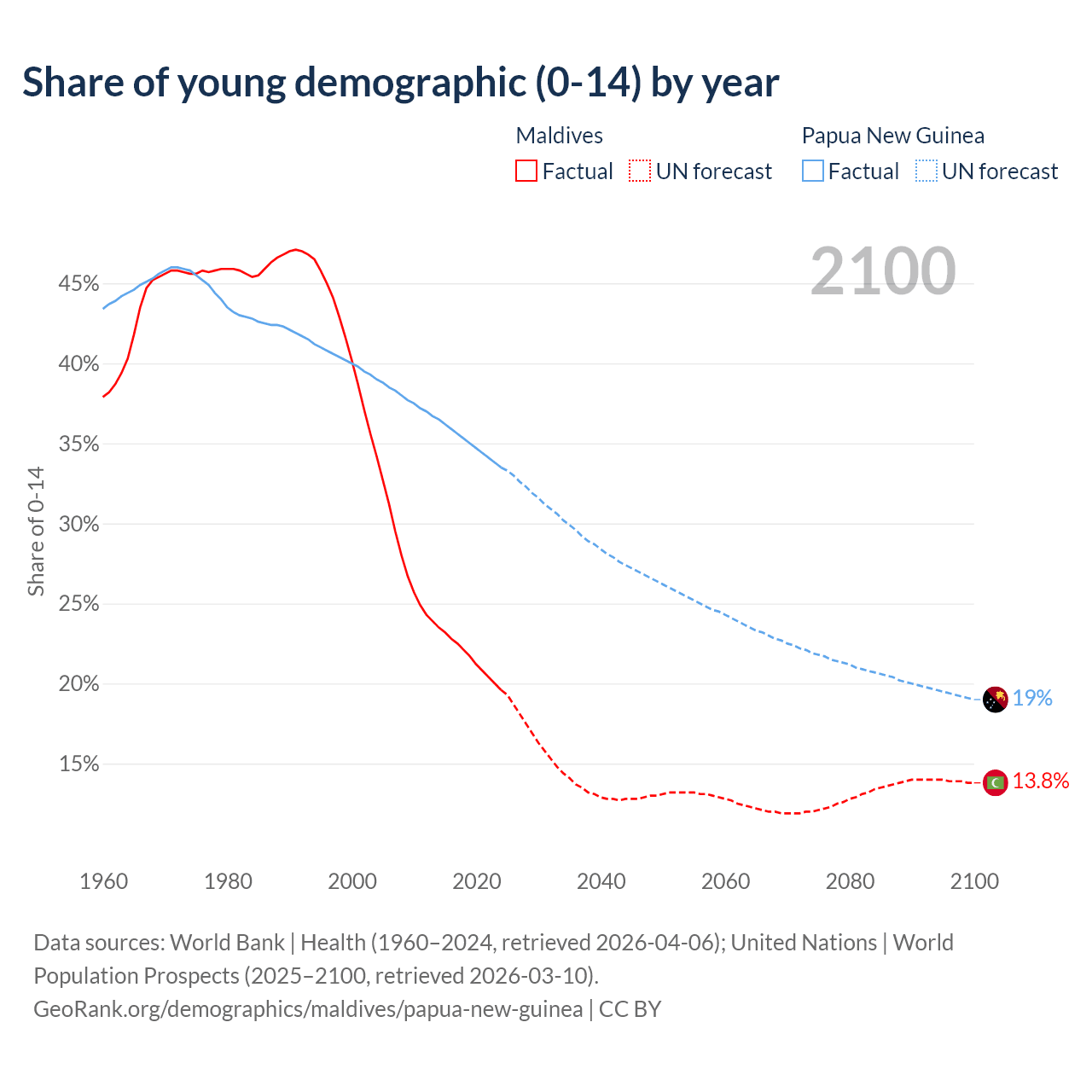 - The share of young demographic (0-15 years old) in Maldives is 19.6% vs 33.5% in Papua New Guinea.