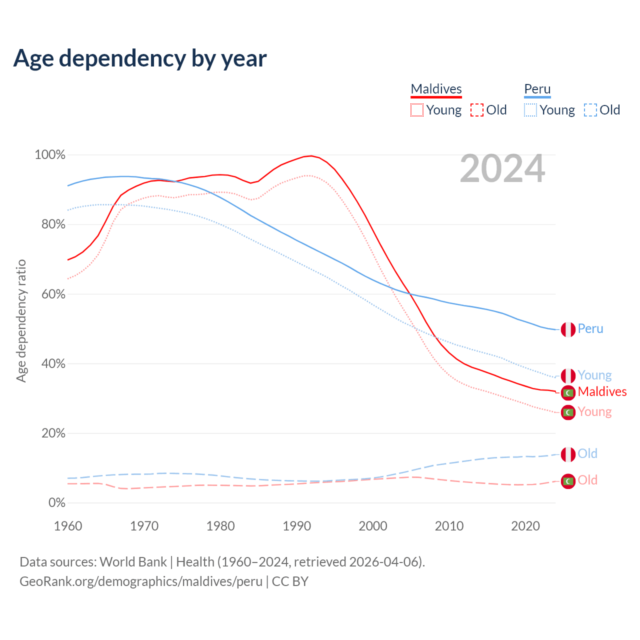 - Maldives is ranked 90/196 by median age (oldest to youngest) vs 97/196 for Peru.
