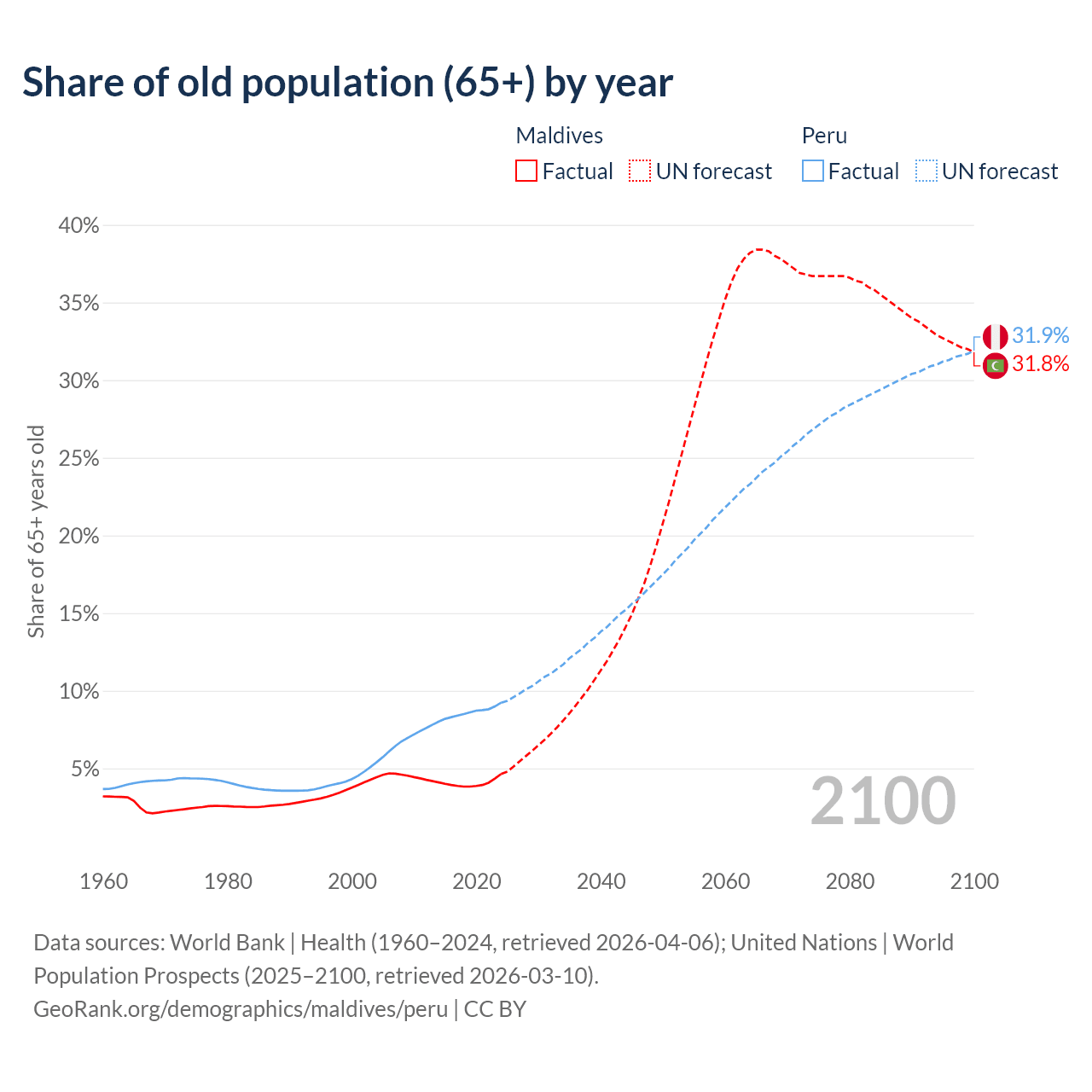 - The share of old-age demographic (65+) in Maldives is 4.64% vs 9.23% in Peru.