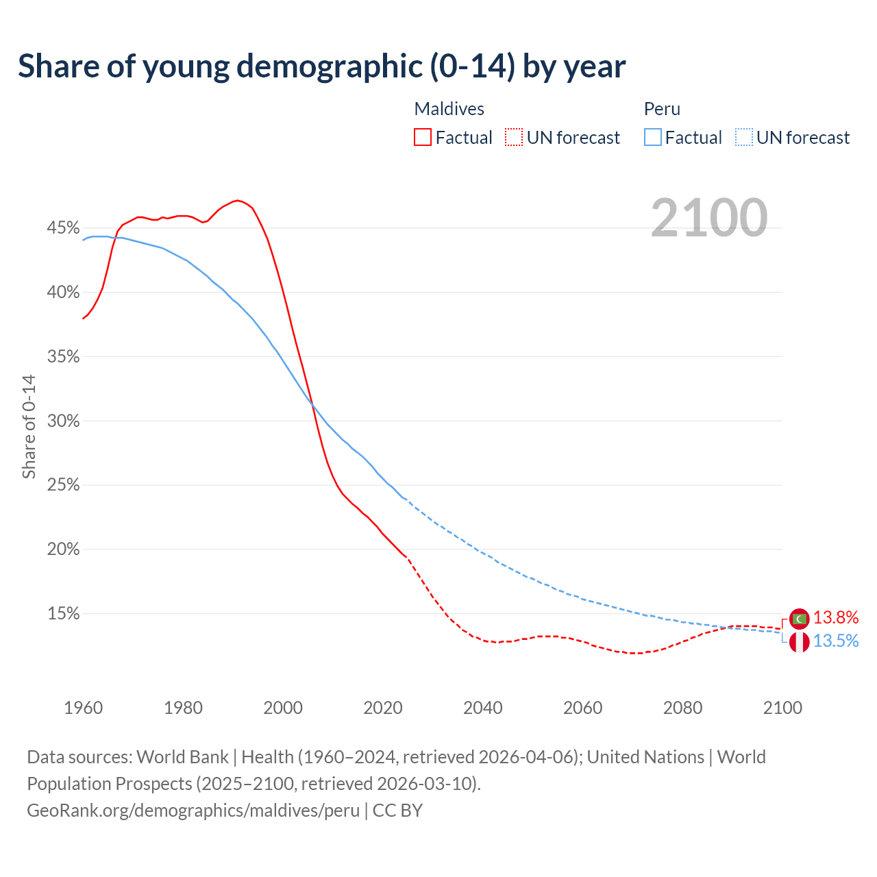 - The share of young demographic (0-15 years old) in Maldives is 19.6% vs 24% in Peru.