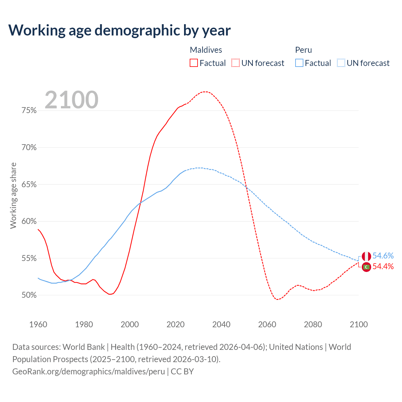 - Maldives has 403K working age adults (aged 15-64) vs 23.4M in Peru.