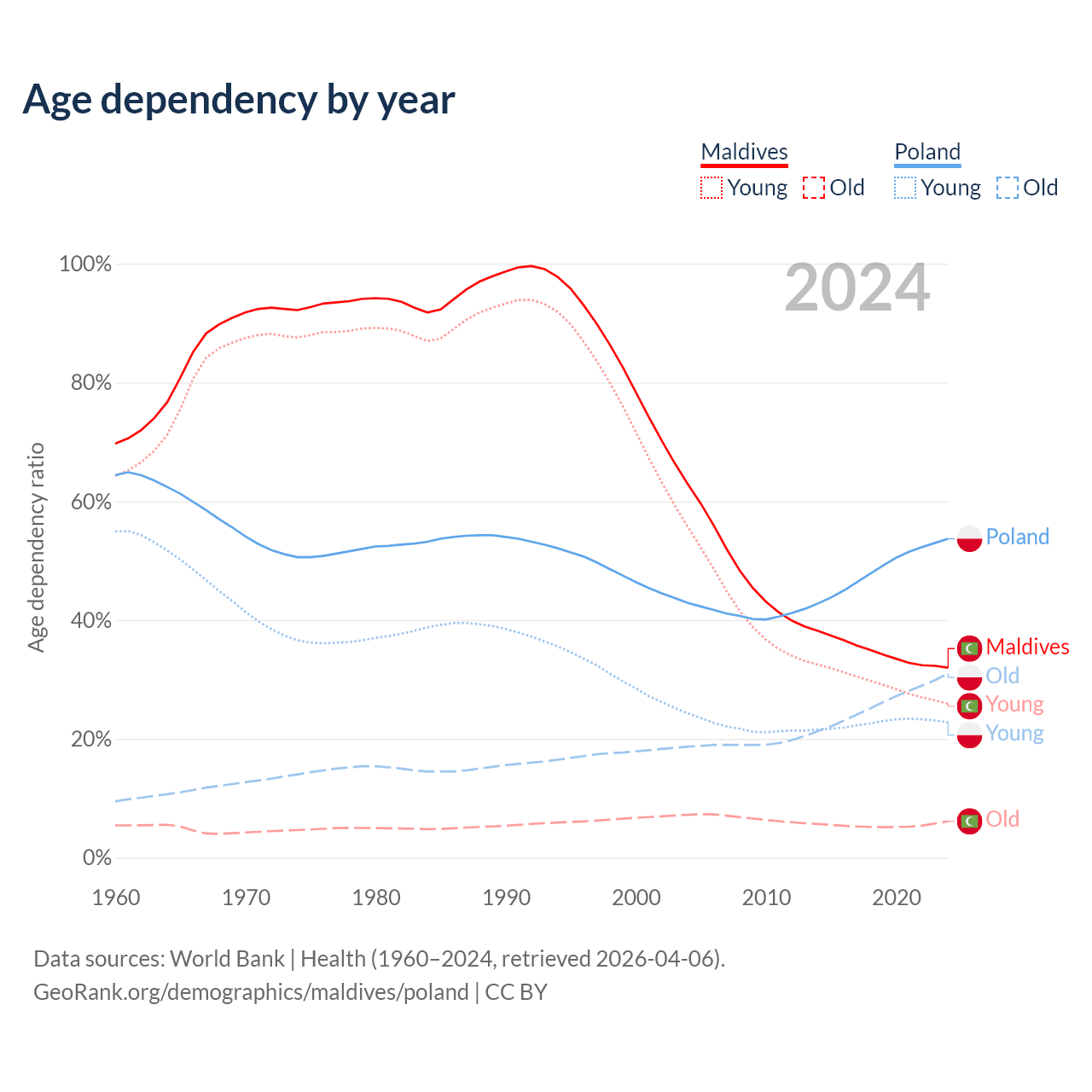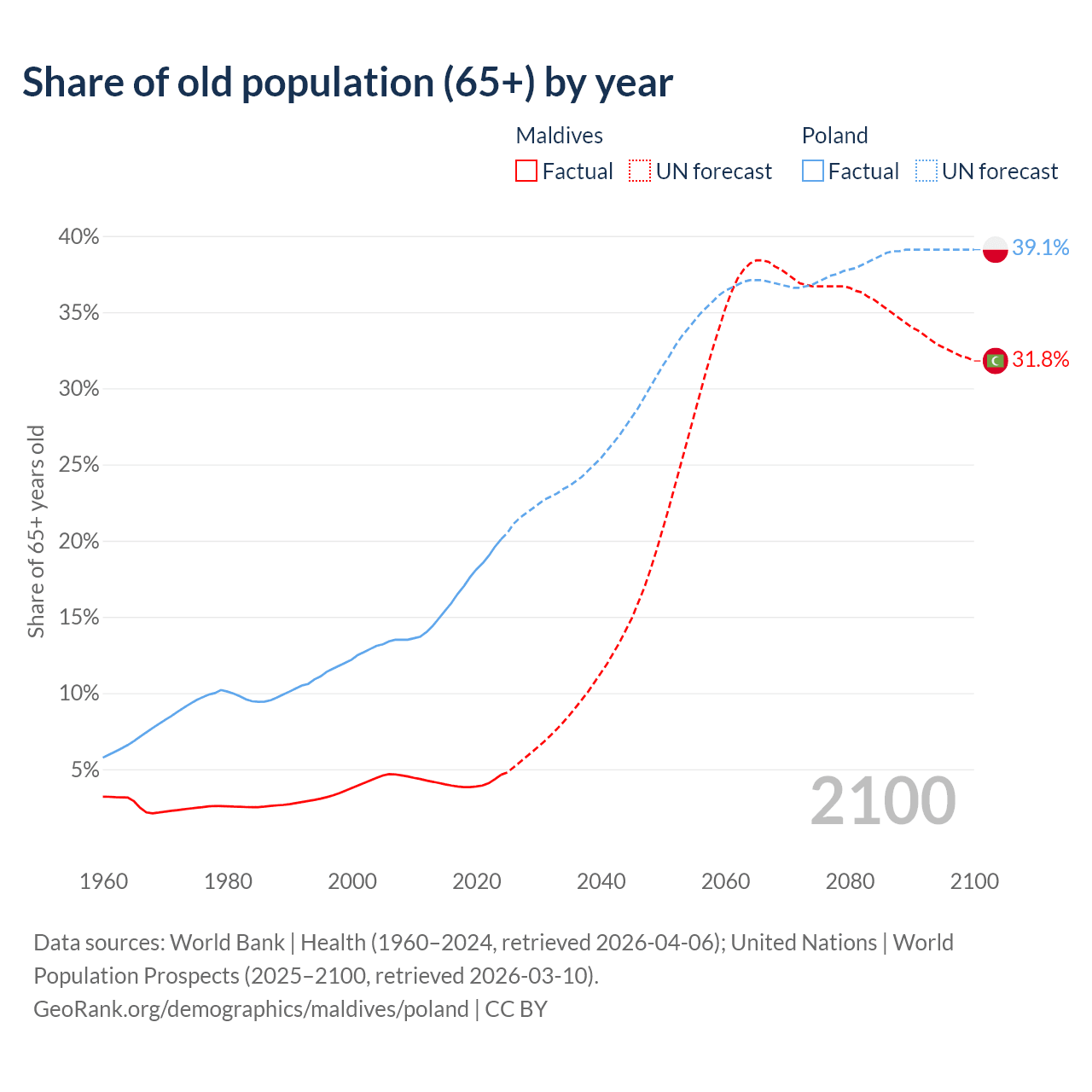 - The share of old-age demographic (65+) in Maldives is 4.64% vs 20.1% in Poland.