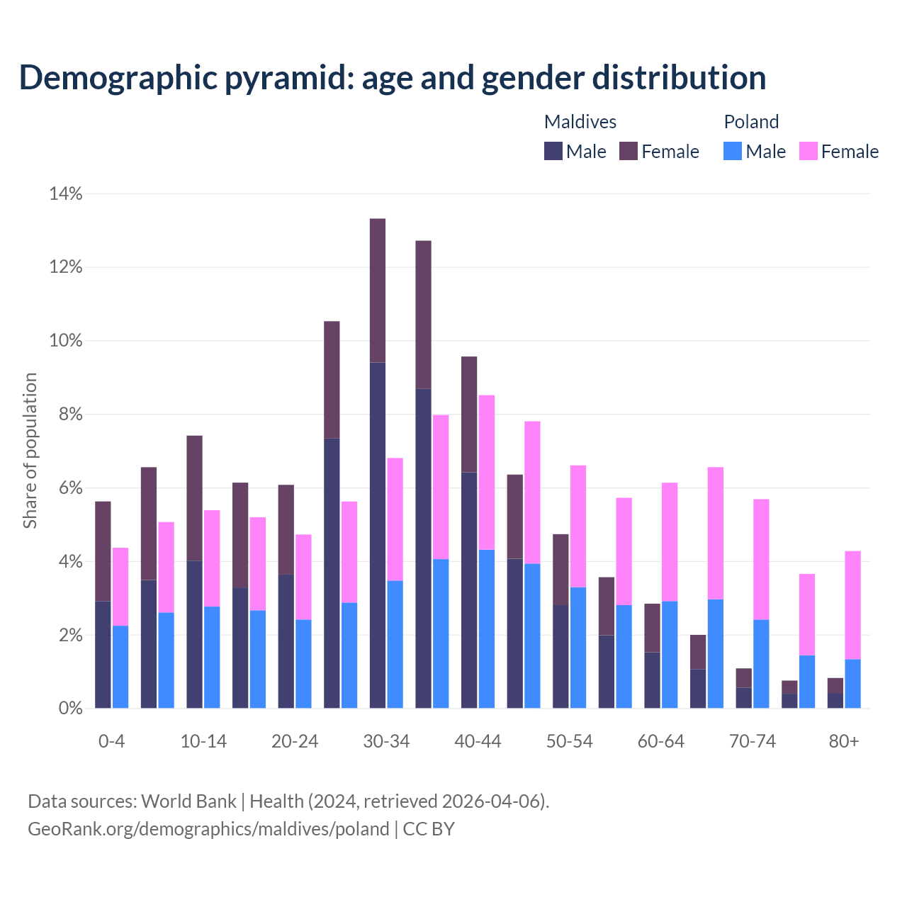 - Maldives is ranked 90/196 by median age (oldest to youngest) vs 30/196 for Poland.