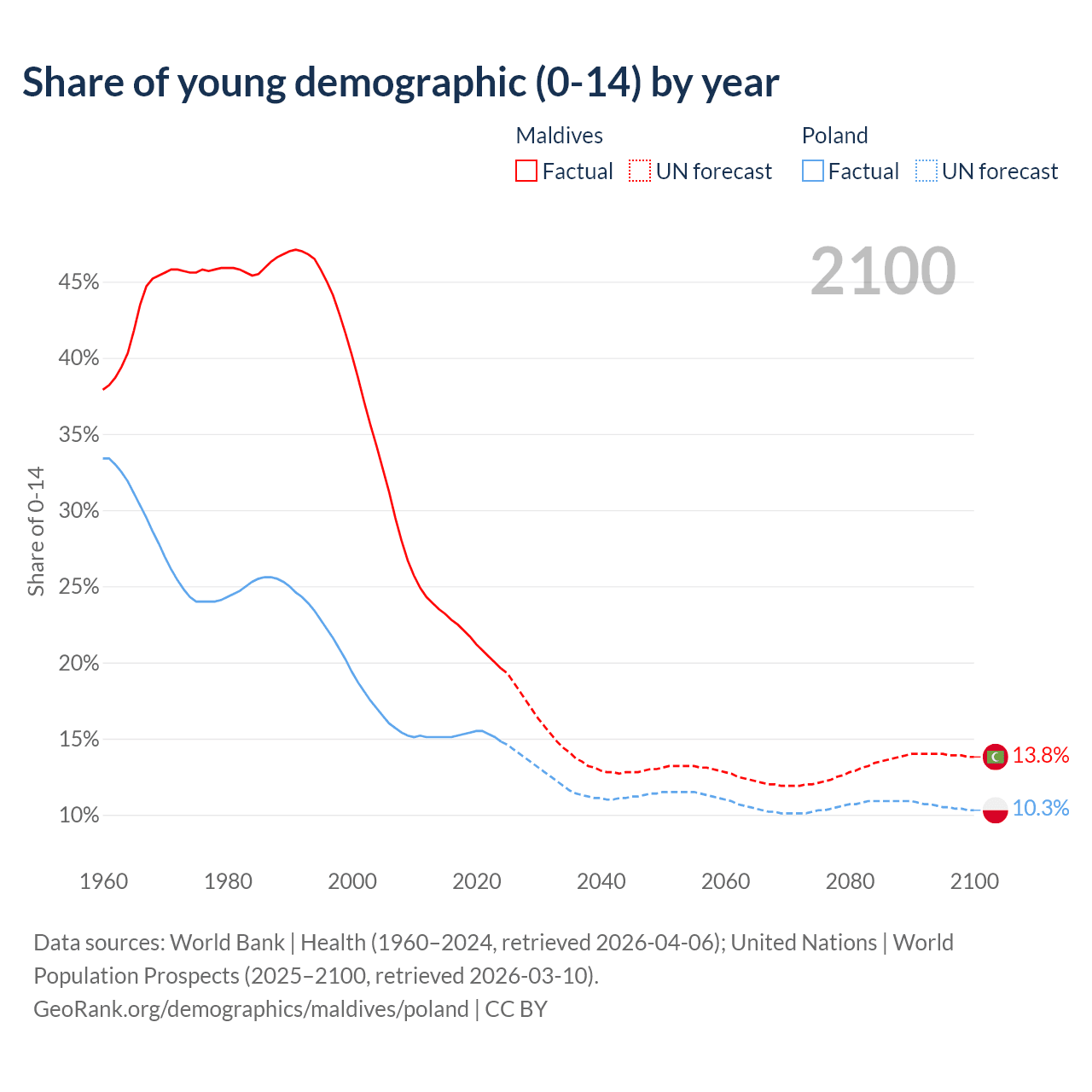 - The share of young demographic (0-15 years old) in Maldives is 19.6% vs 14.8% in Poland.
