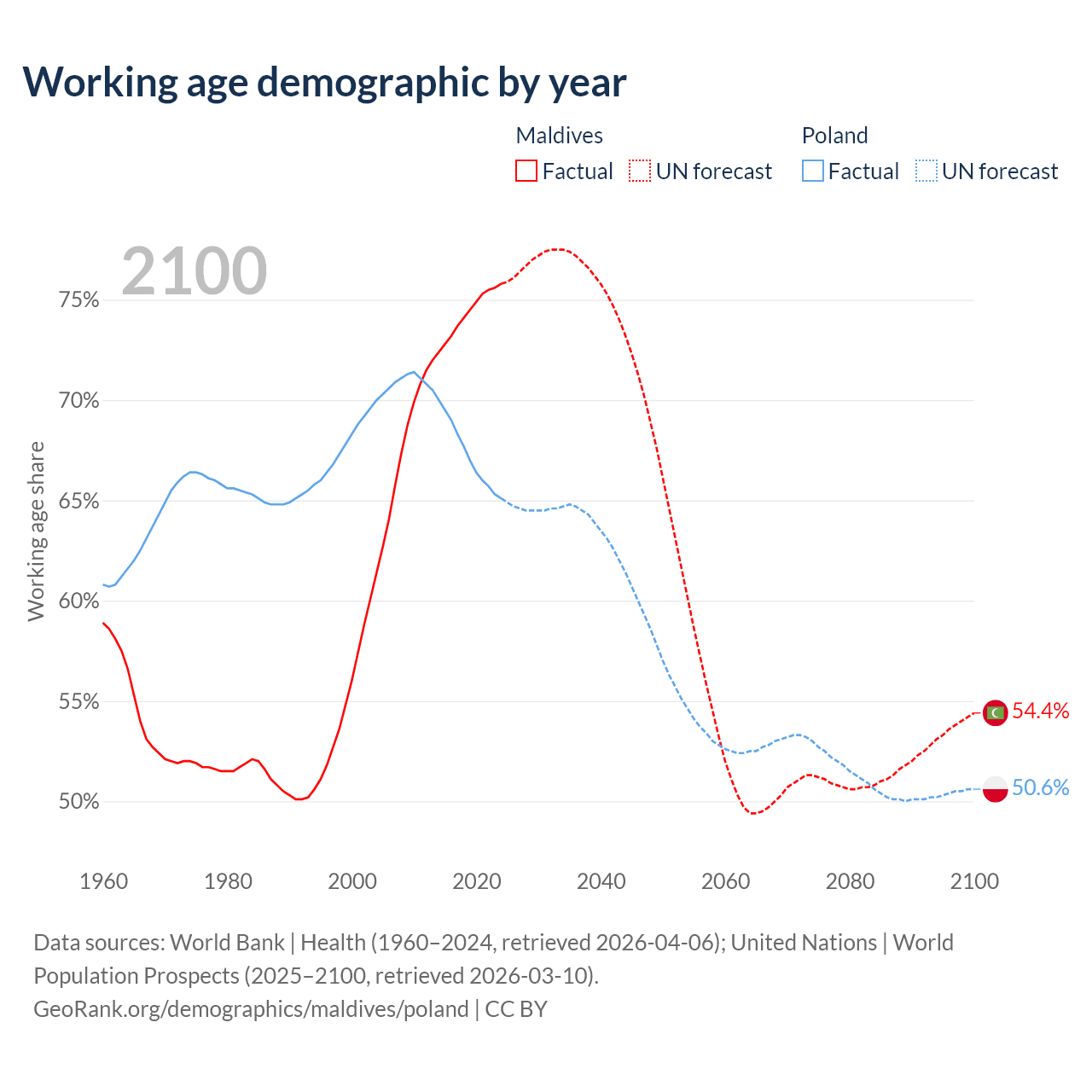 - Maldives has 403K working age adults (aged 15-64) vs 23.3M in Poland.