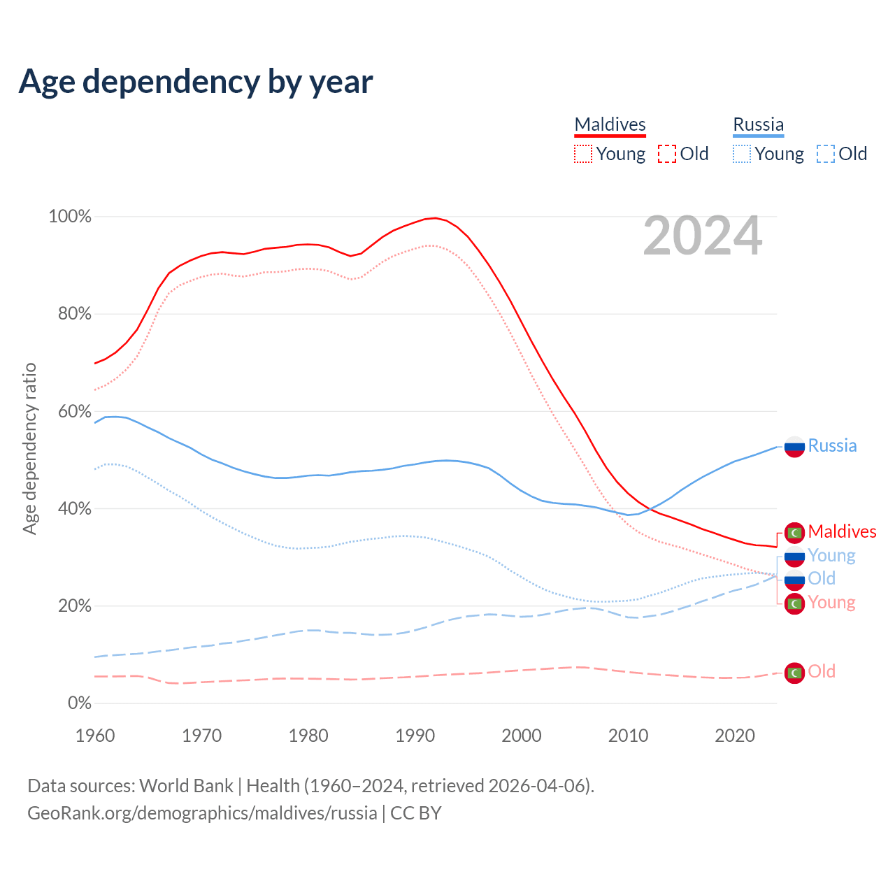Data sources: World Bank | Health (1960–2024, retrieved 2026-04-06); U.S. Census Bureau (1960–2024, retrieved 2026-02-08).