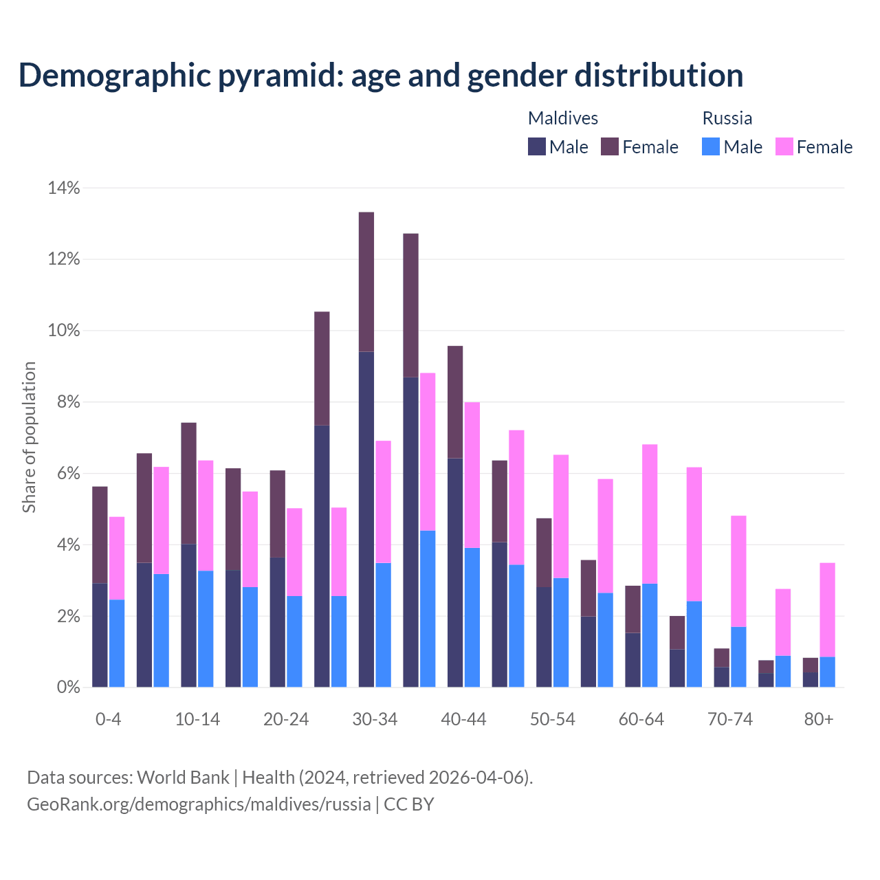 - Maldives is ranked 90/196 by median age (oldest to youngest) vs 42/196 for Russia.