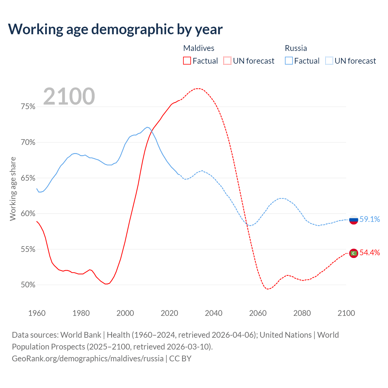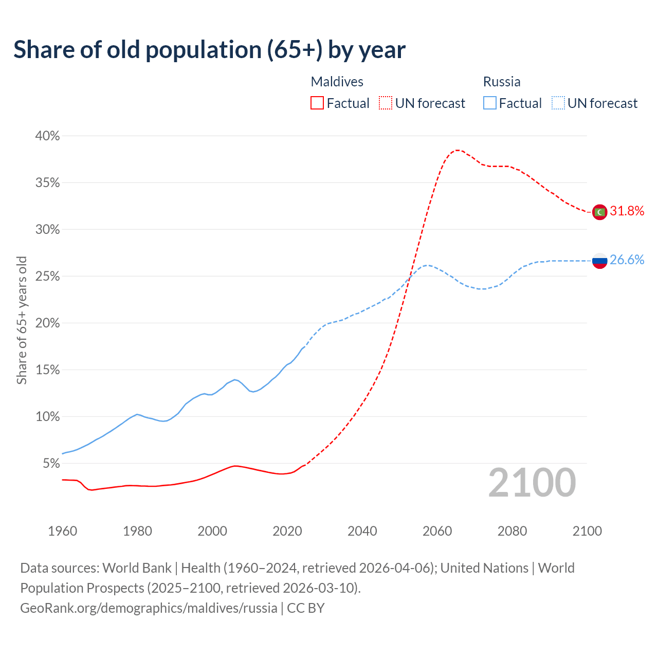 Median age Maldives vs Russia, 1960-2100