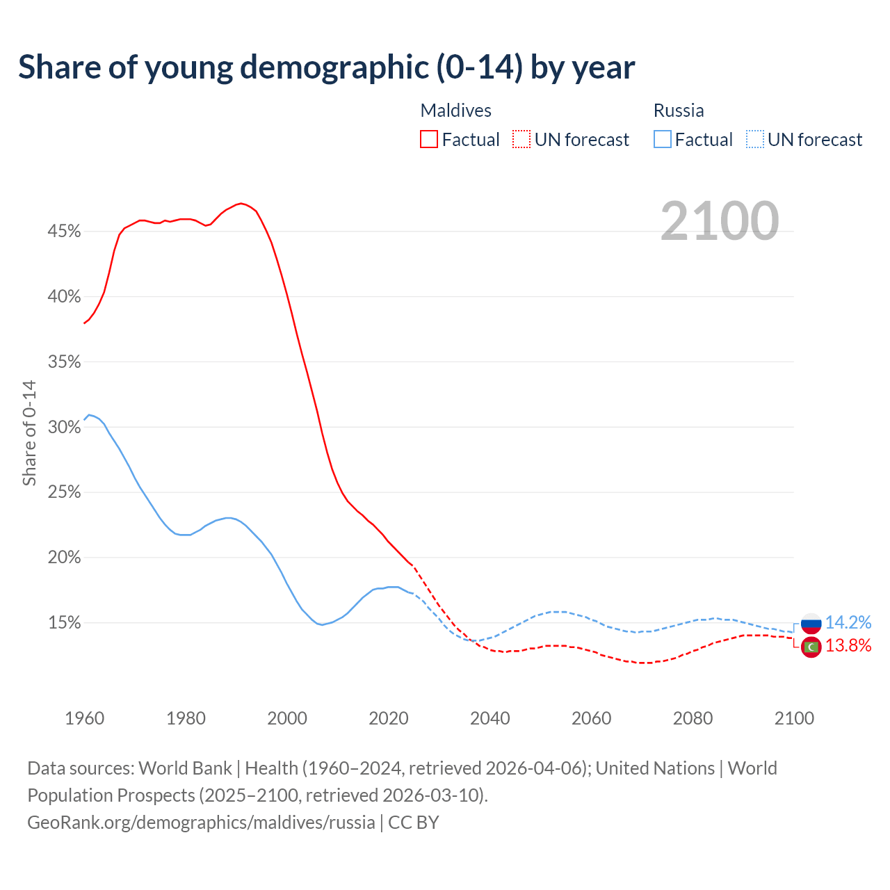 - The share of young demographic (0-15 years old) in Maldives is 19.6% vs 17.3% in Russia.