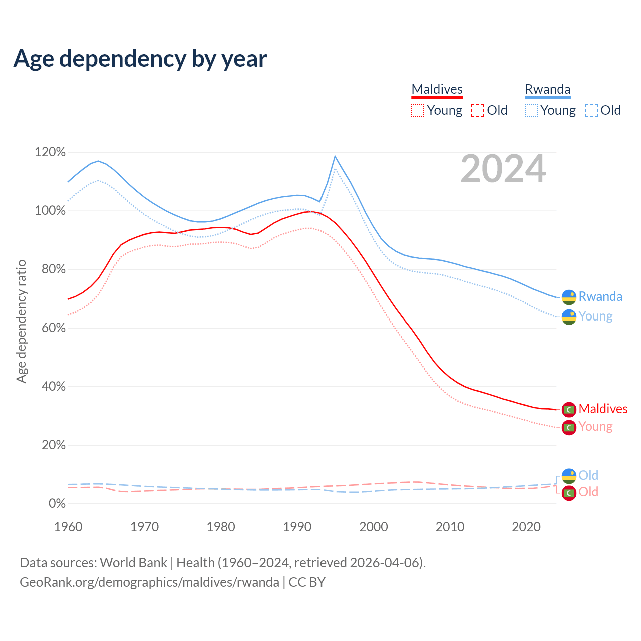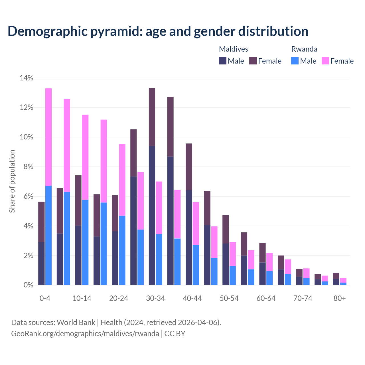 - Maldives is ranked 90/196 by median age (oldest to youngest) vs 160/196 for Rwanda.