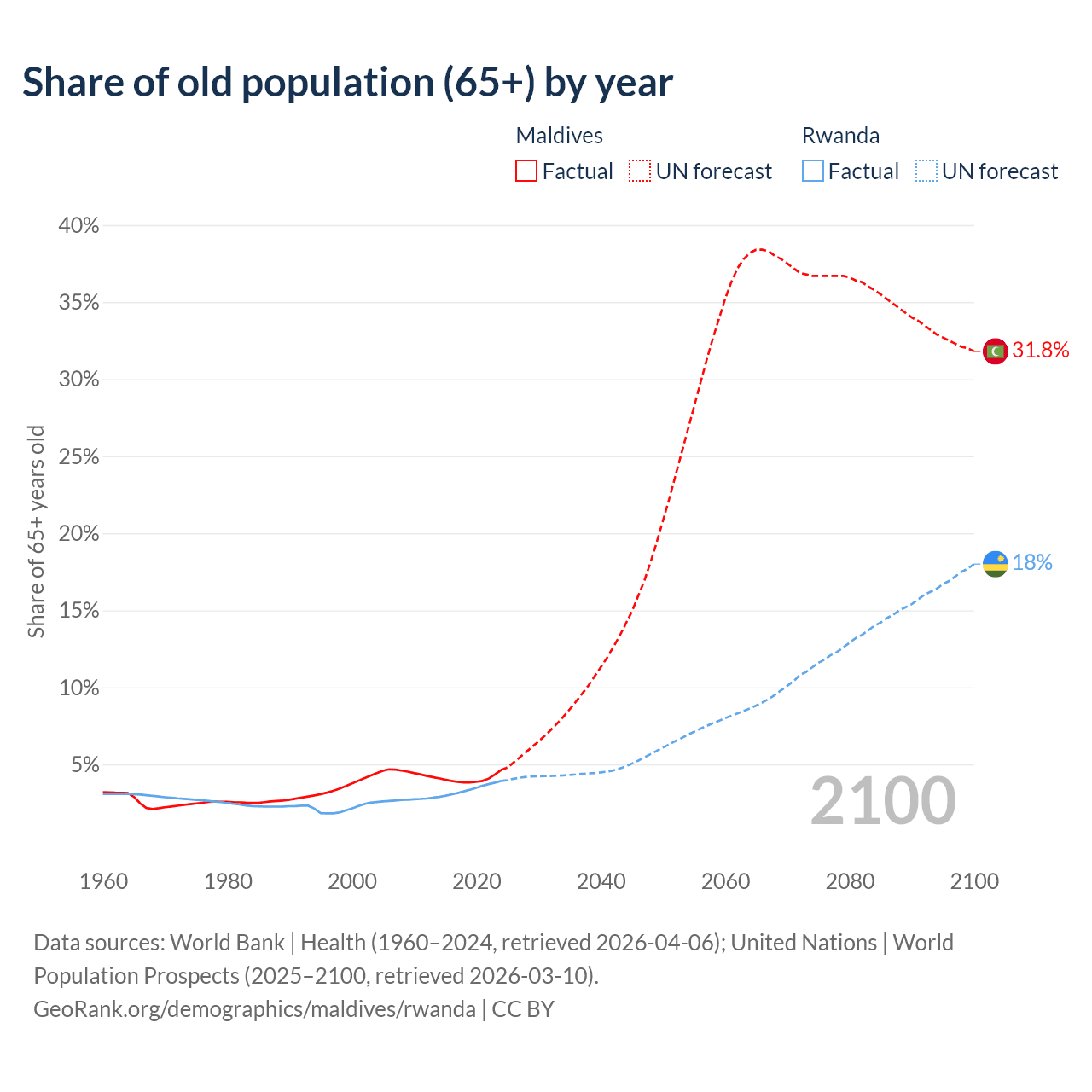 - The share of old-age demographic (65+) in Maldives is 4.64% vs 3.93% in Rwanda.