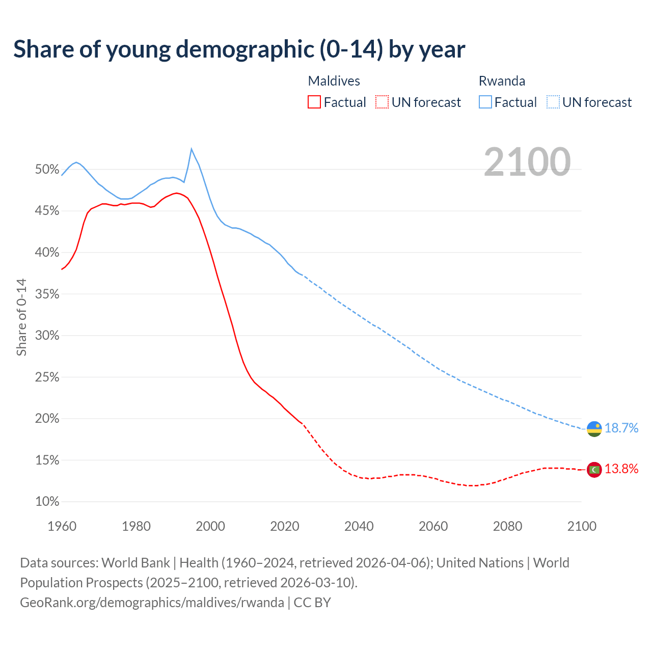 - The share of young demographic (0-15 years old) in Maldives is 19.6% vs 37.4% in Rwanda.