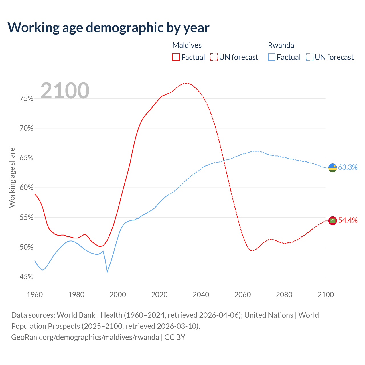 - Maldives has 403K working age adults (aged 15-64) vs 8.79M in Rwanda.