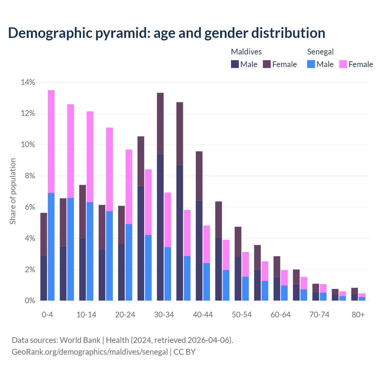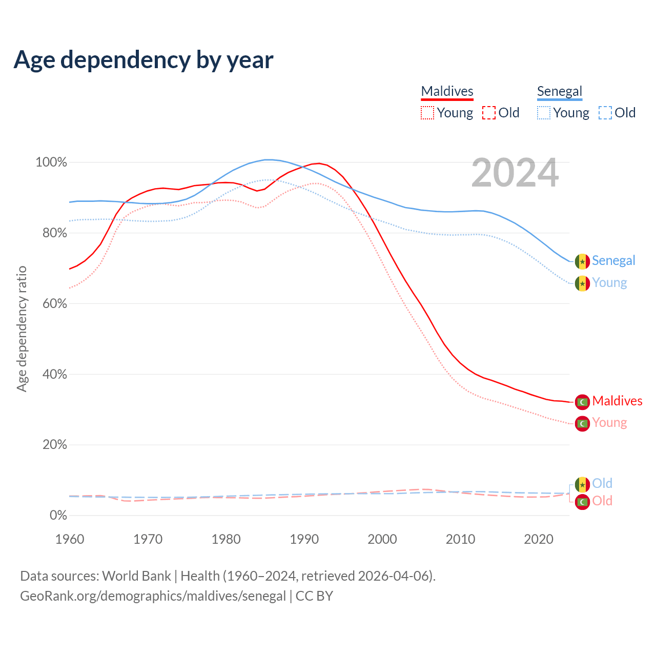 - The share of old-age demographic (65+) in Maldives is 4.64% vs 3.62% in Senegal.