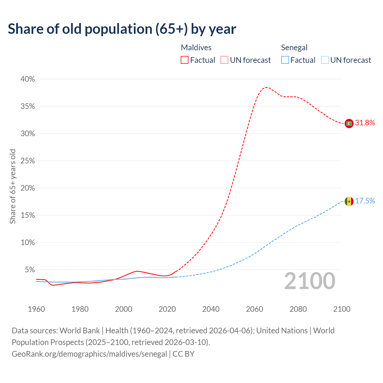 The share of older people aged 65 and over is 4.64% in Maldives and 3.62% in Senegal. Life expectancy in Maldives compared to Senegal .