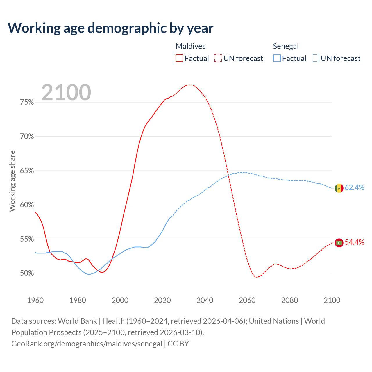 Median age Maldives vs Senegal, 1960-2100