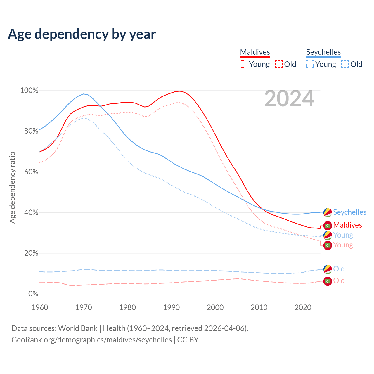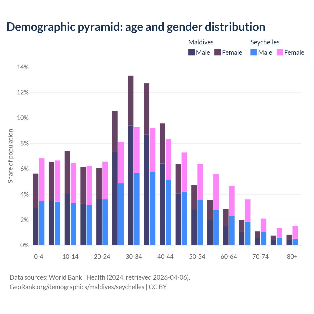 - Maldives is ranked 90/196 by median age (oldest to youngest) vs 76/196 for the Seychelles.