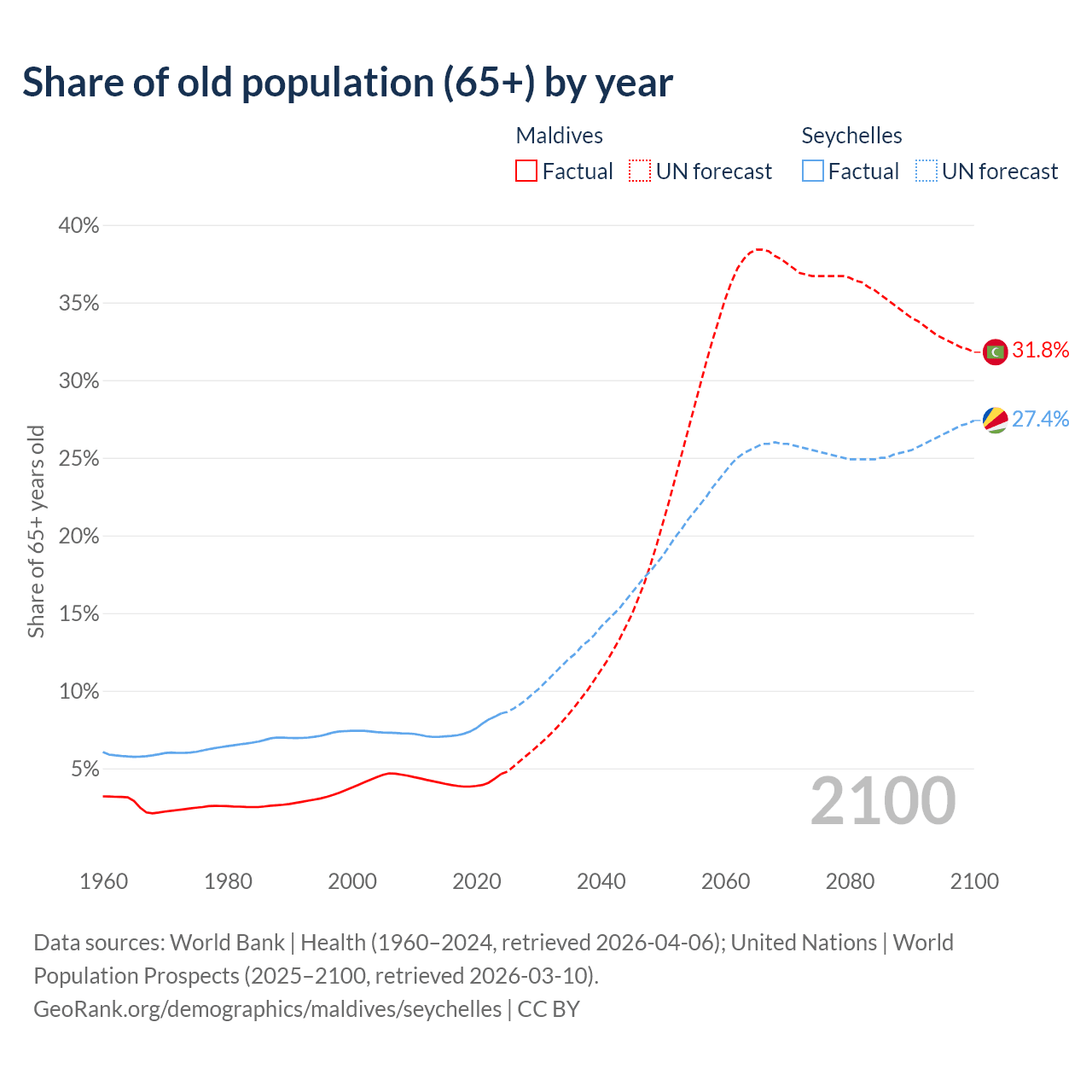 The share of older people aged 65 and over is 4.64% in Maldives and 8.54% in the Seychelles. Life expectancy in Maldives compared to the Seychelles .