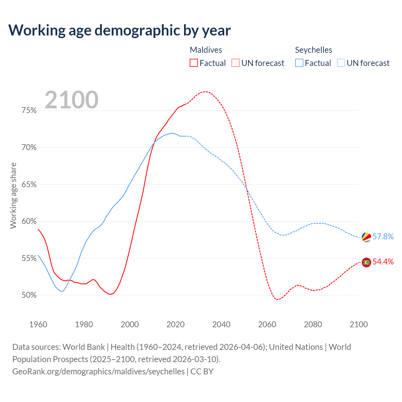 - Maldives has 403K working age adults (aged 15-64) vs 90.3K in the Seychelles.
