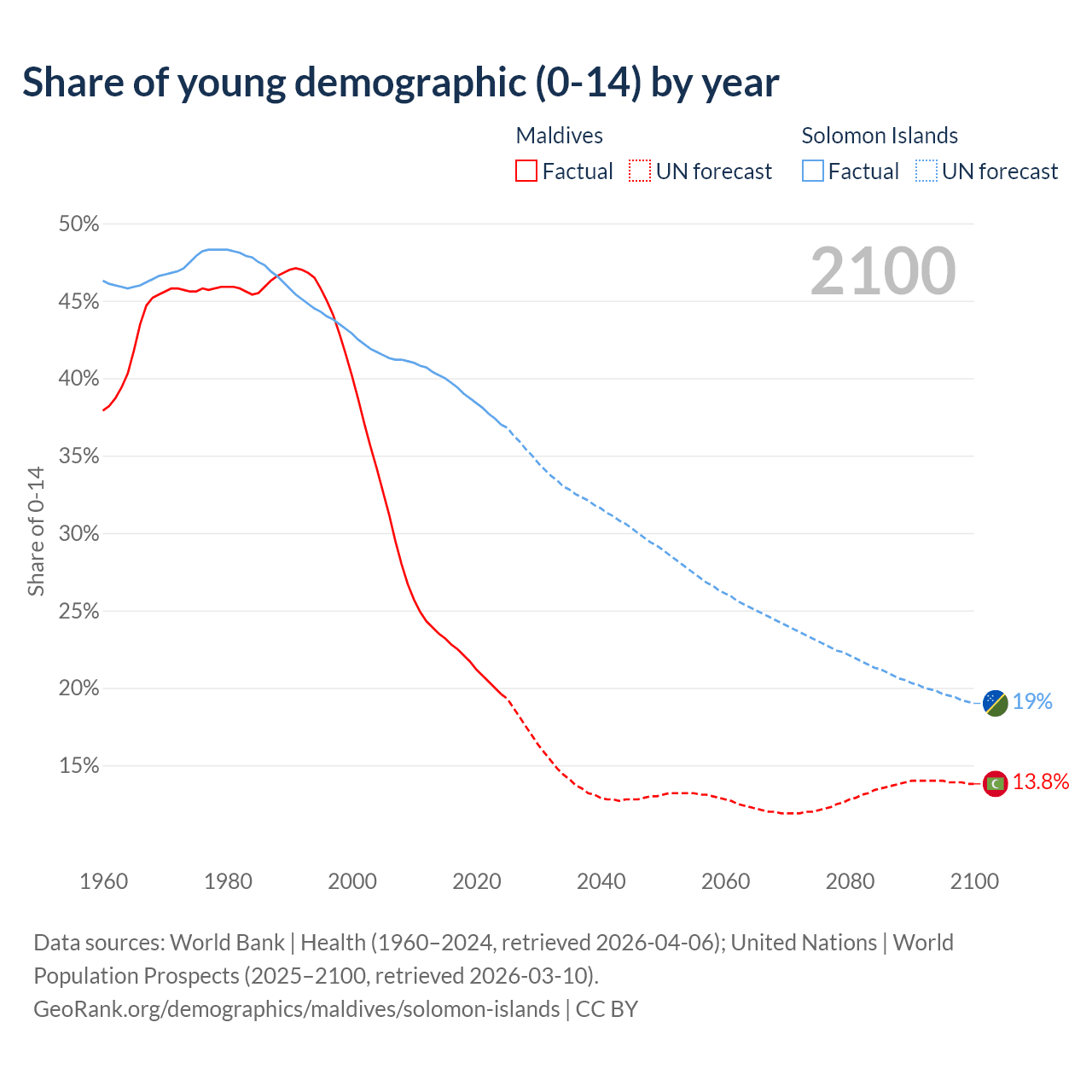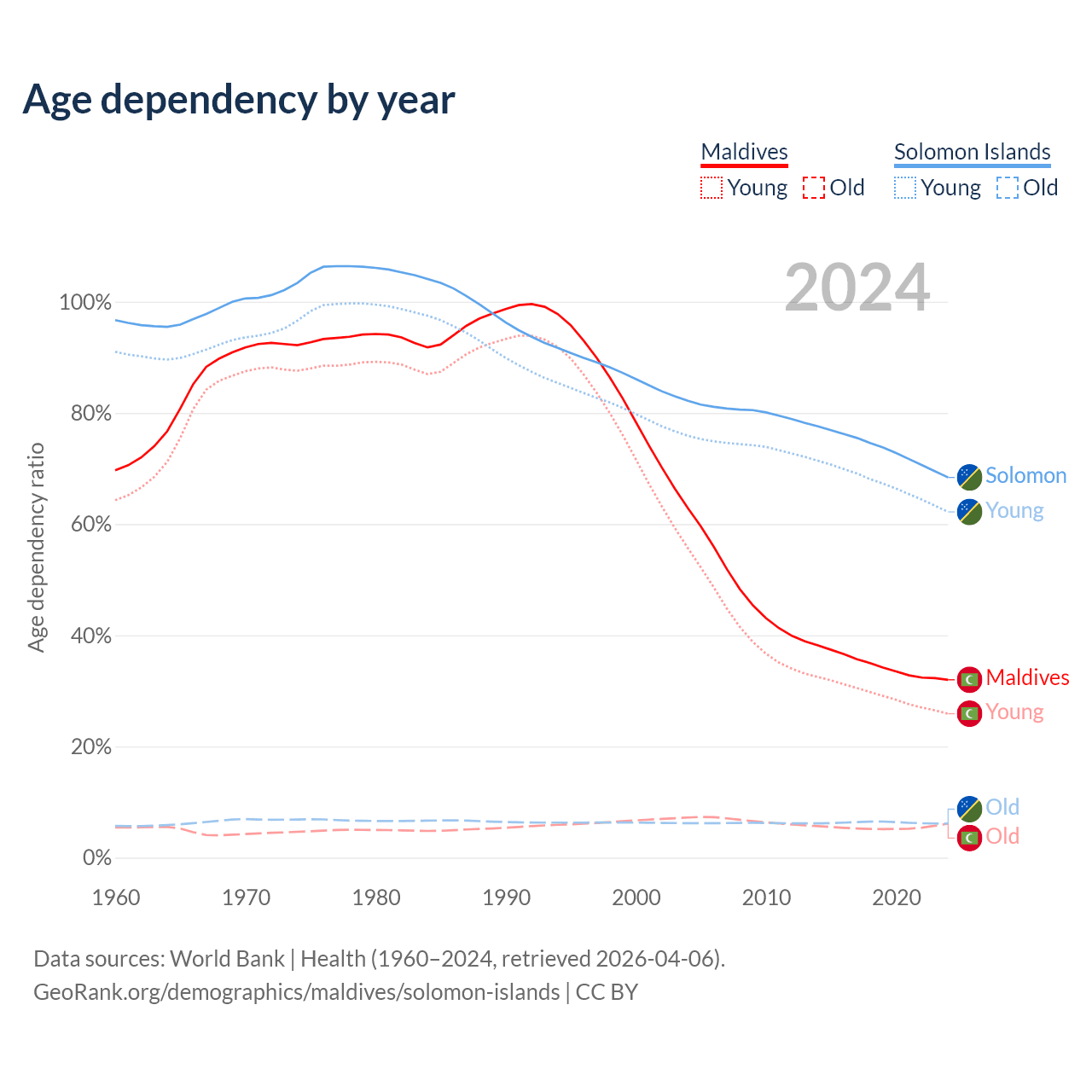 - Maldives is ranked 90/196 by median age (oldest to youngest) vs 153/196 for the Solomon Islands.