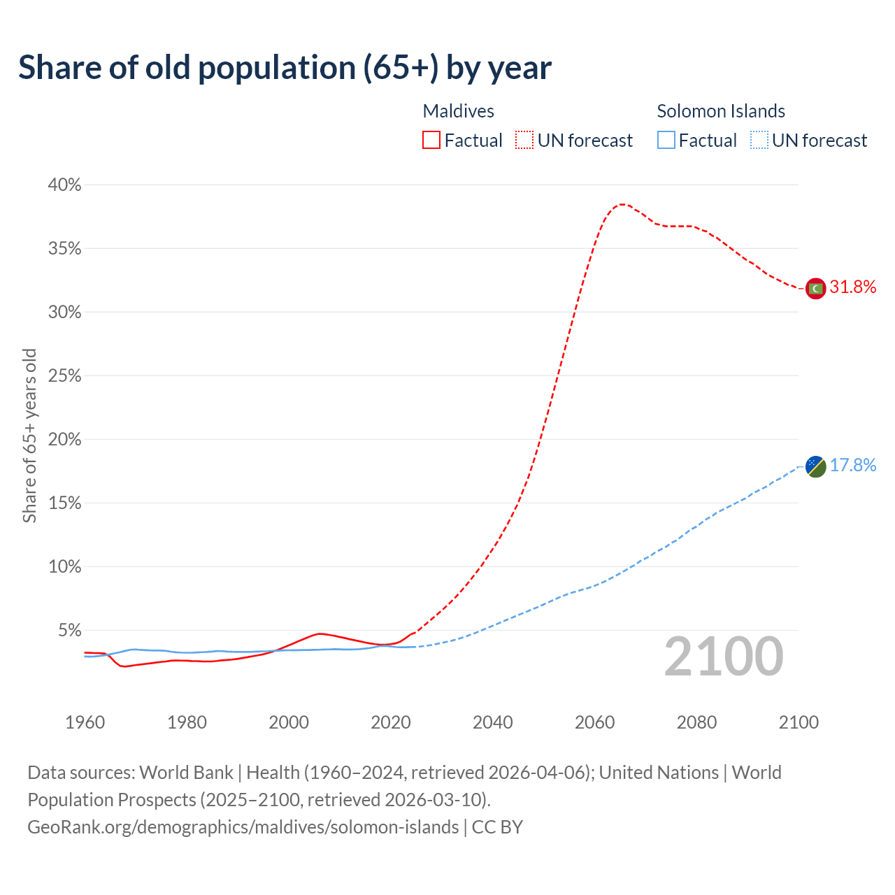 - The share of old-age demographic (65+) in Maldives is 4.64% vs 3.64% in the Solomon Islands.