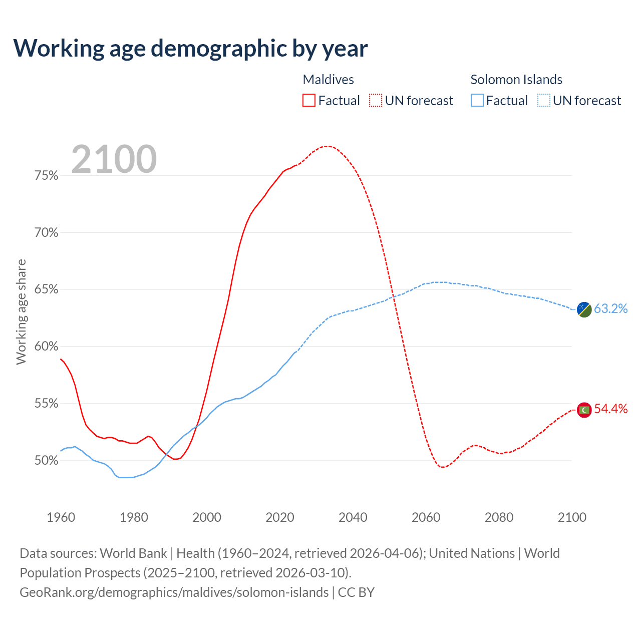 - Maldives has 403K working age adults (aged 15-64) vs 513K in the Solomon Islands.