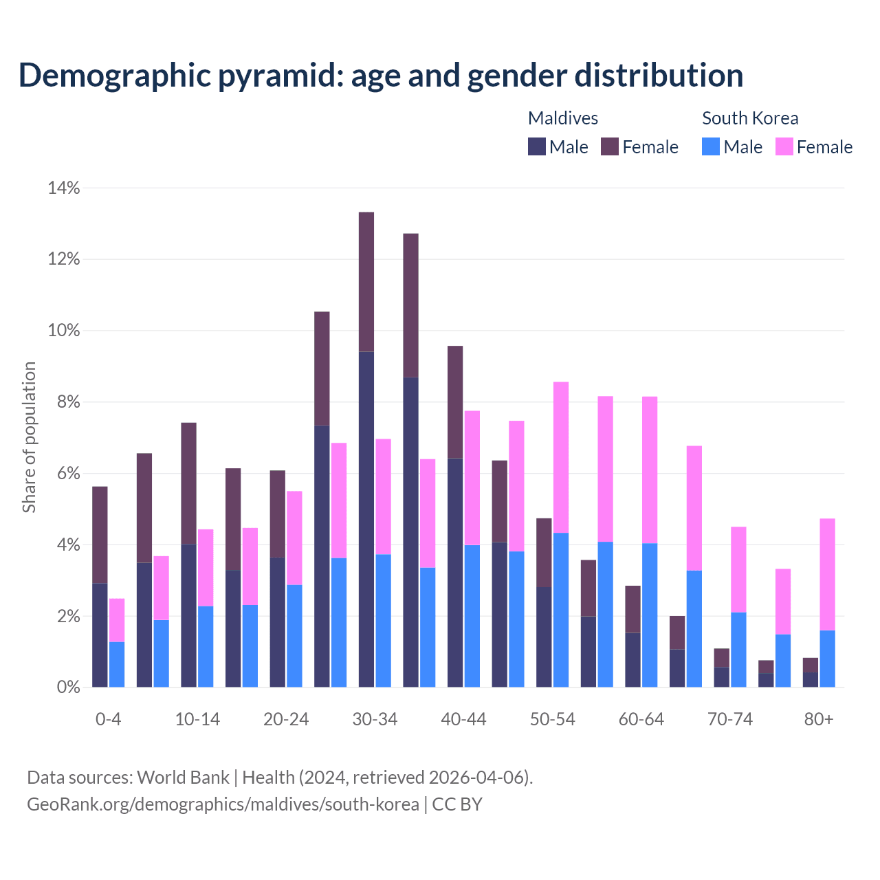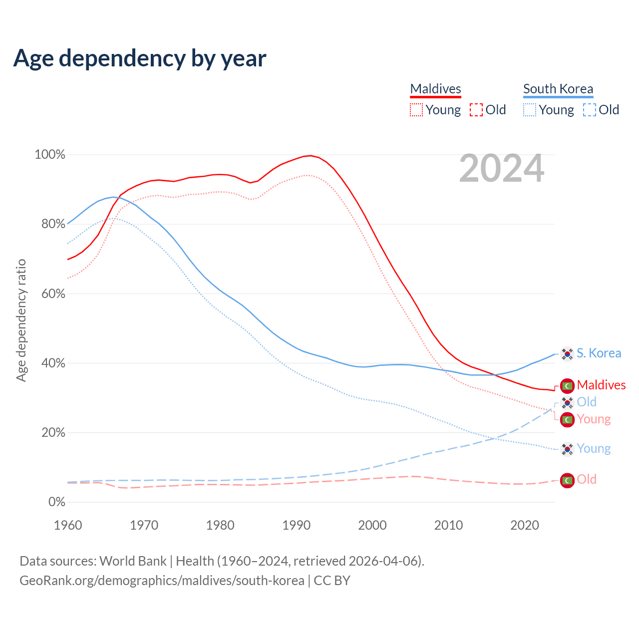 - Maldives is ranked 90/196 by median age (oldest to youngest) vs 10/196 for South Korea.
