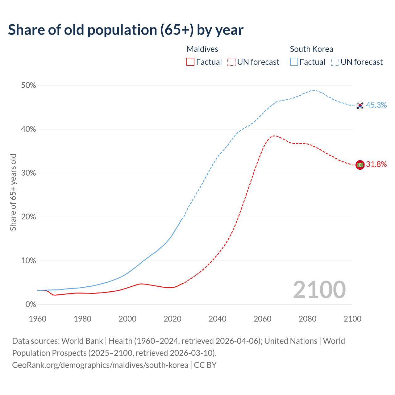 The share of older people aged 65 and over is 4.64% in Maldives and 19.3% in South Korea. Life expectancy in Maldives compared to South Korea .