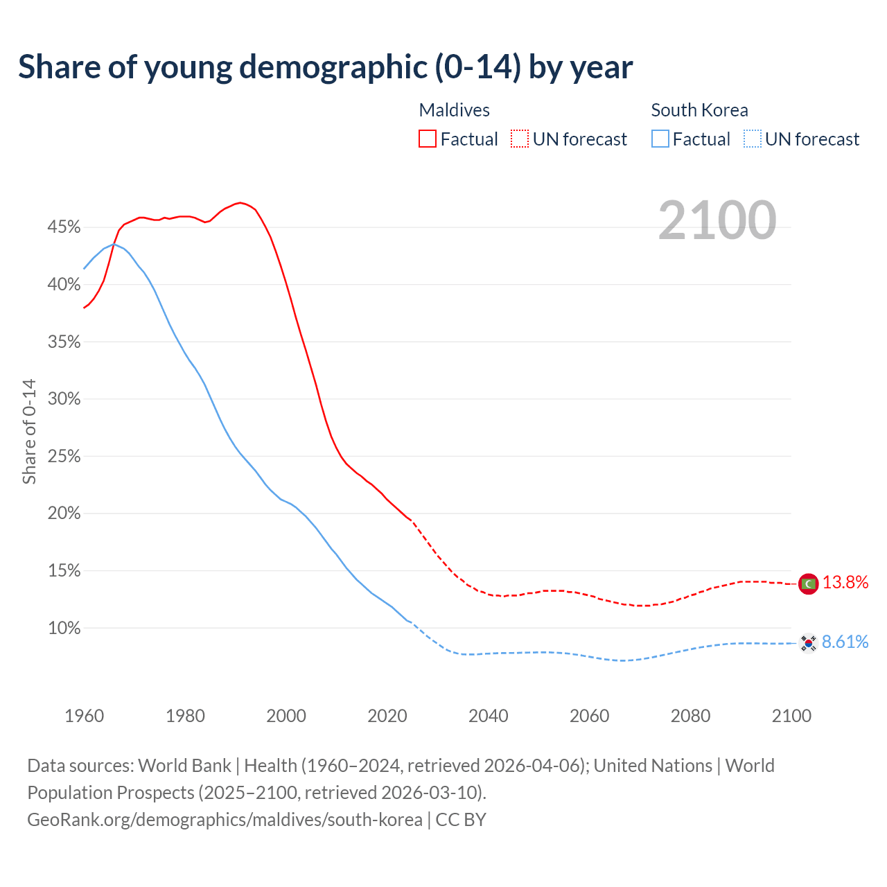 - The share of young demographic (0-15 years old) in Maldives is 19.6% vs 10.6% in South Korea.
