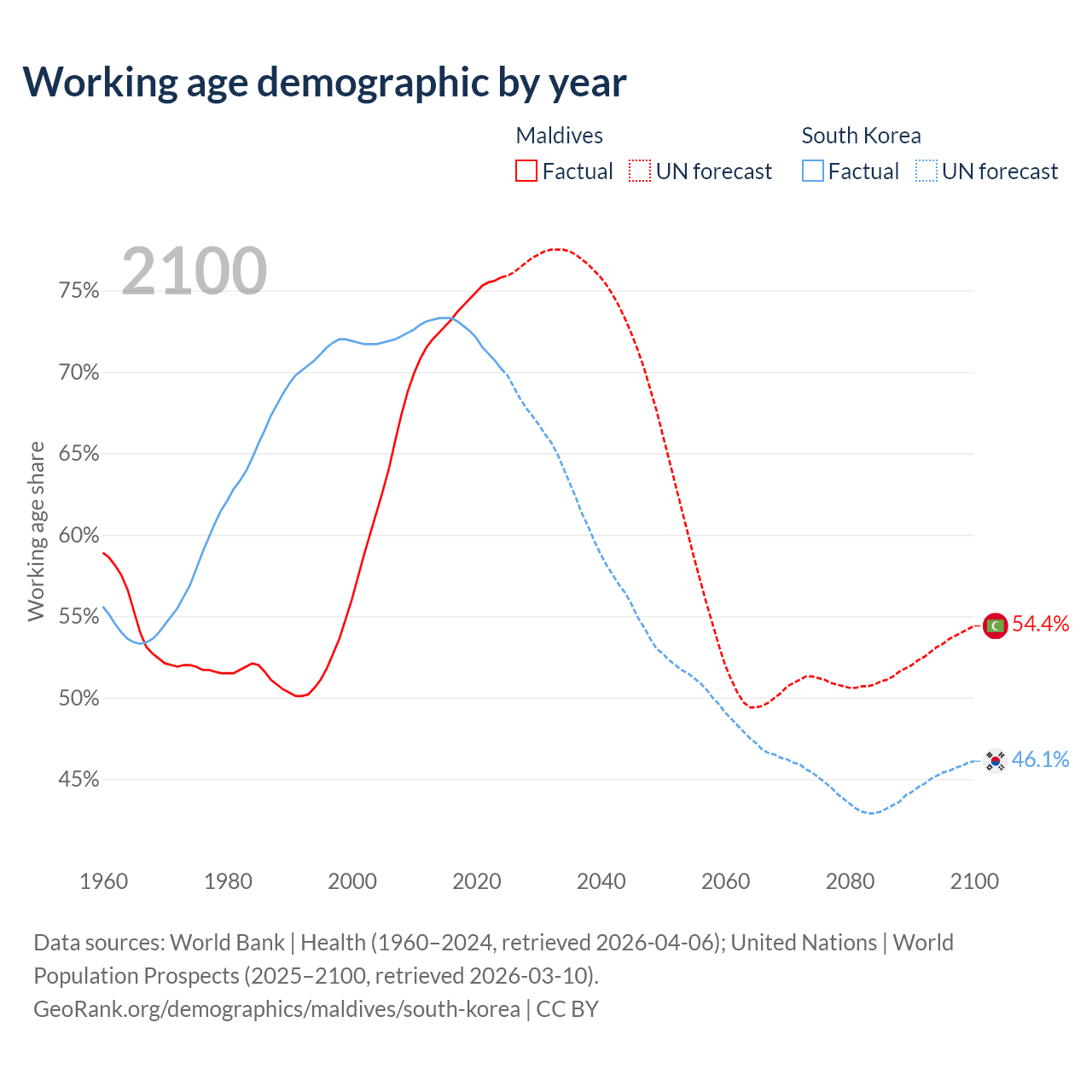 Median age Maldives vs South Korea, 1960-2100