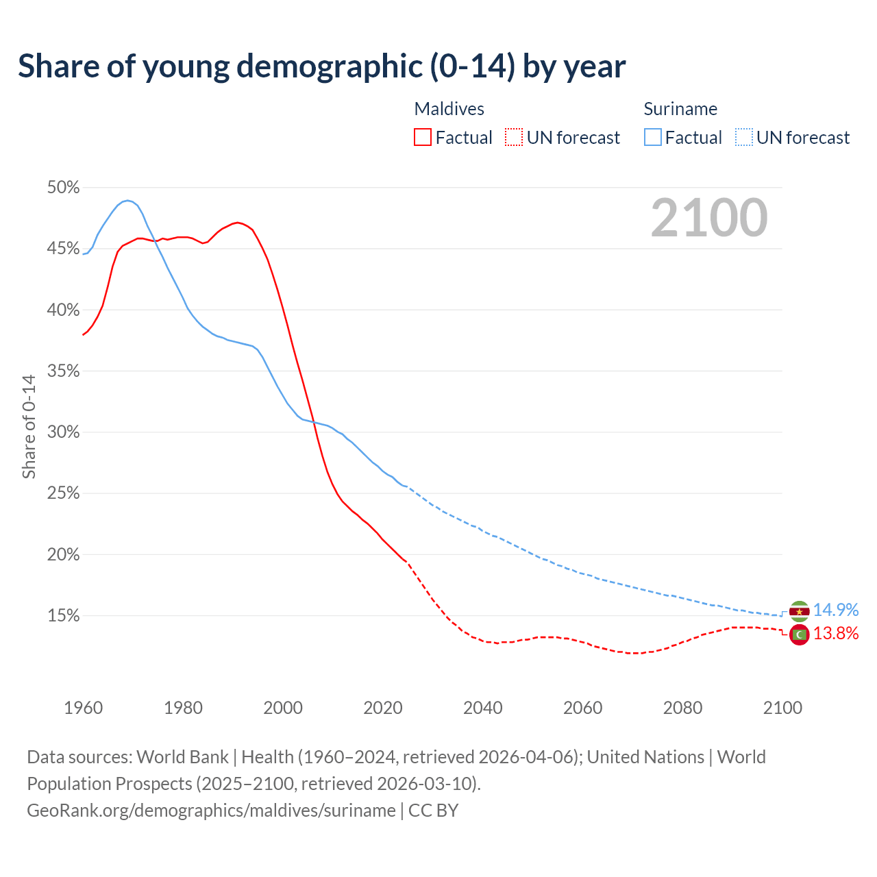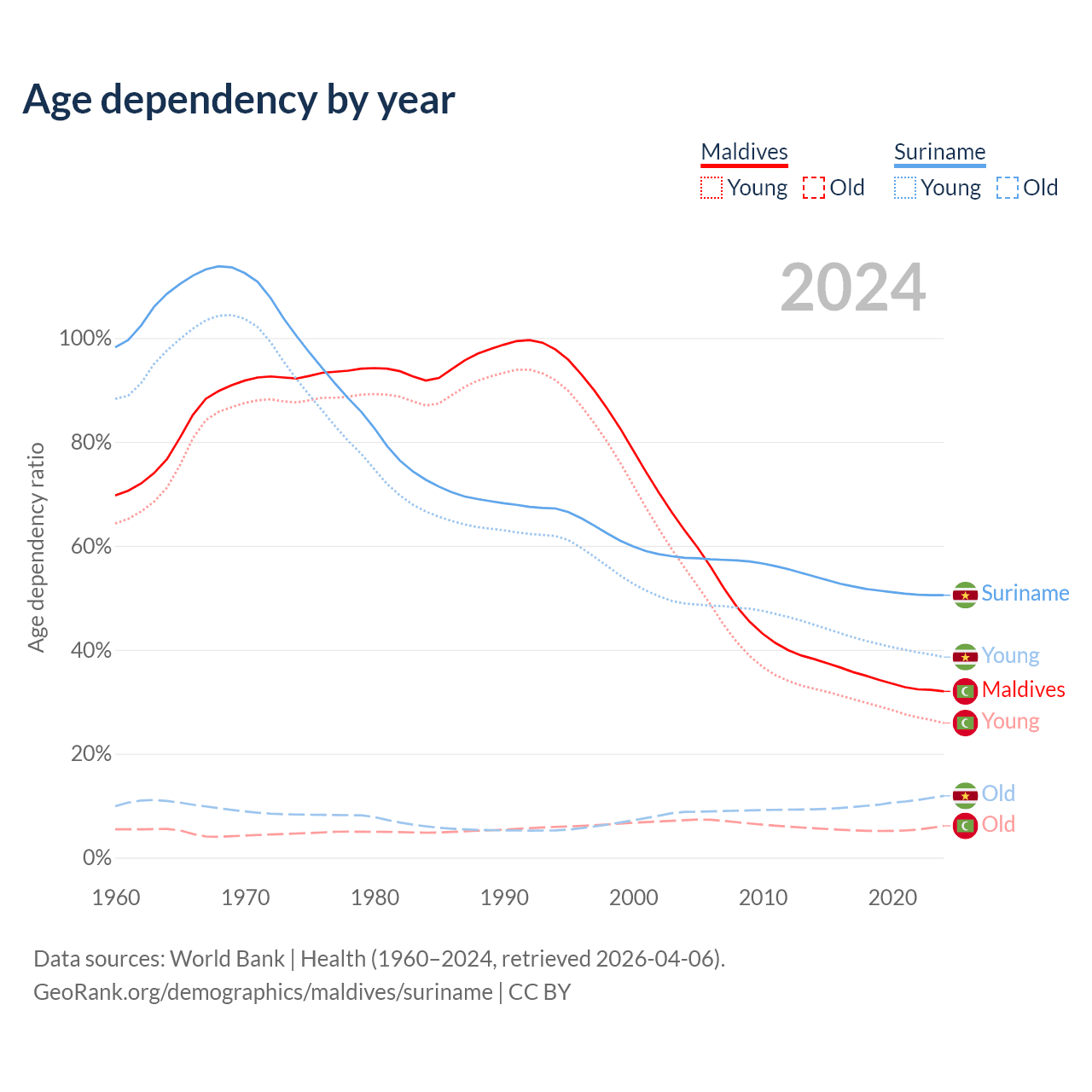 - The share of young demographic (0-15 years old) in Maldives is 19.6% vs 25.6% in Suriname.