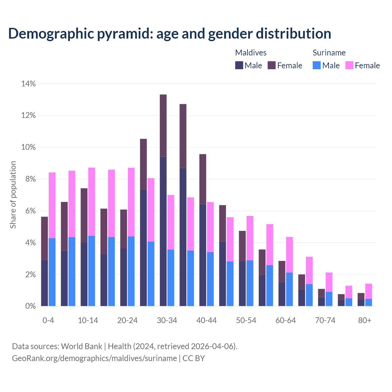 - Maldives is ranked 90/196 by median age (oldest to youngest) vs 109/196 for Suriname.