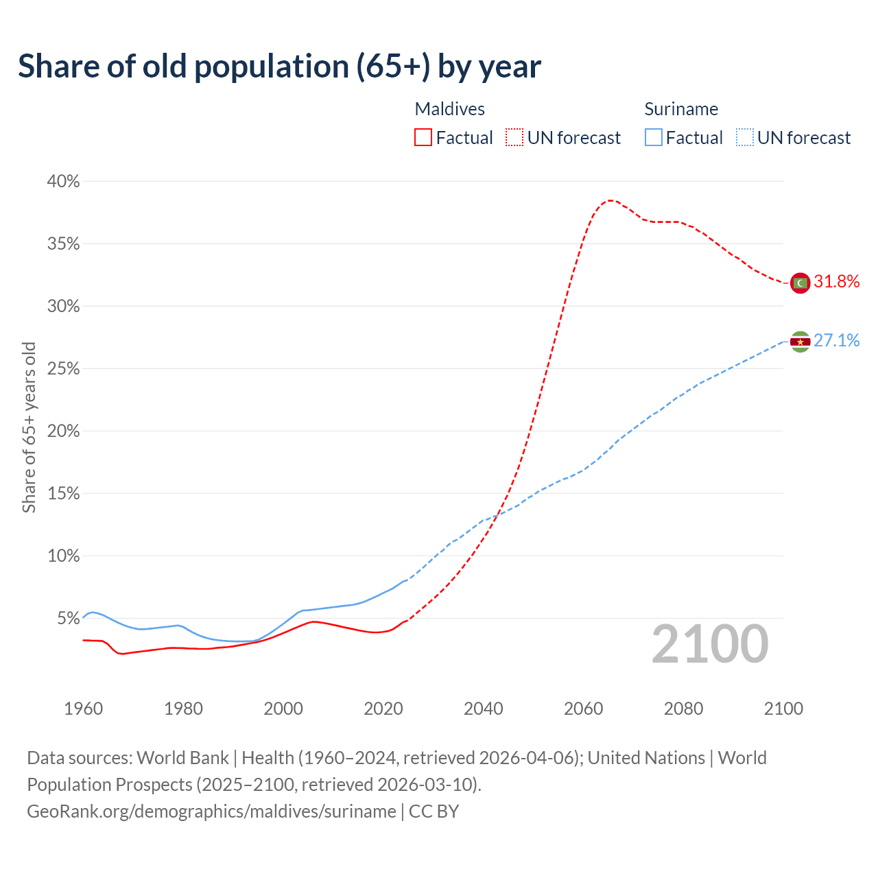 - The share of old-age demographic (65+) in Maldives is 4.64% vs 7.9% in Suriname.