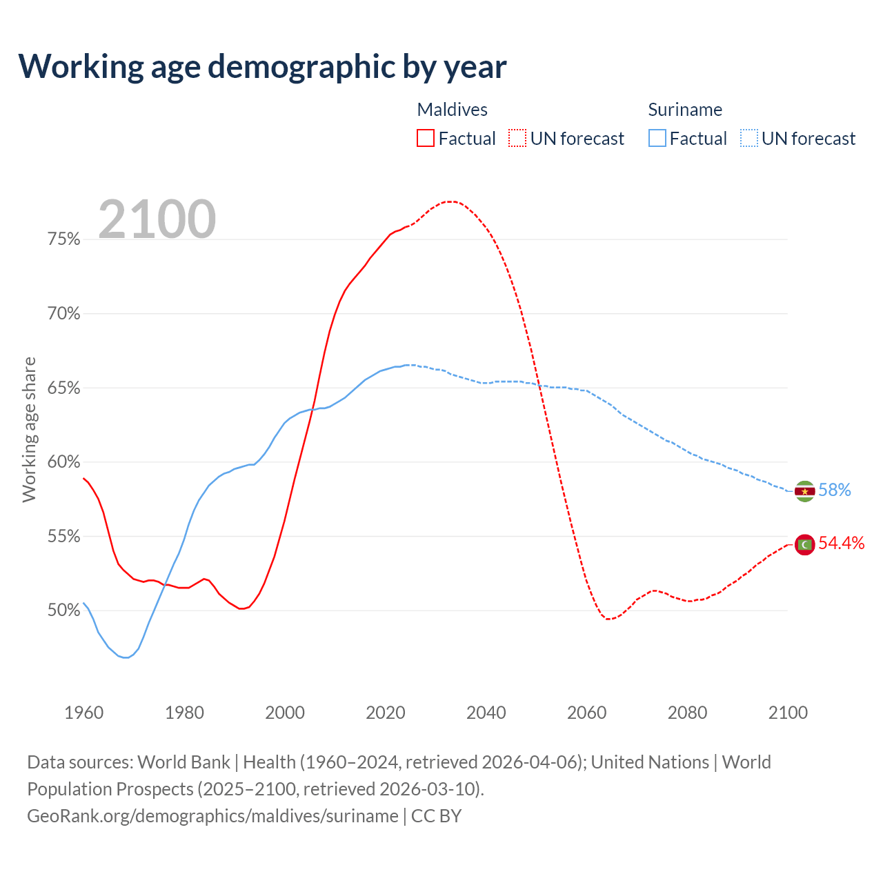 Median age Maldives vs Suriname, 1960-2100