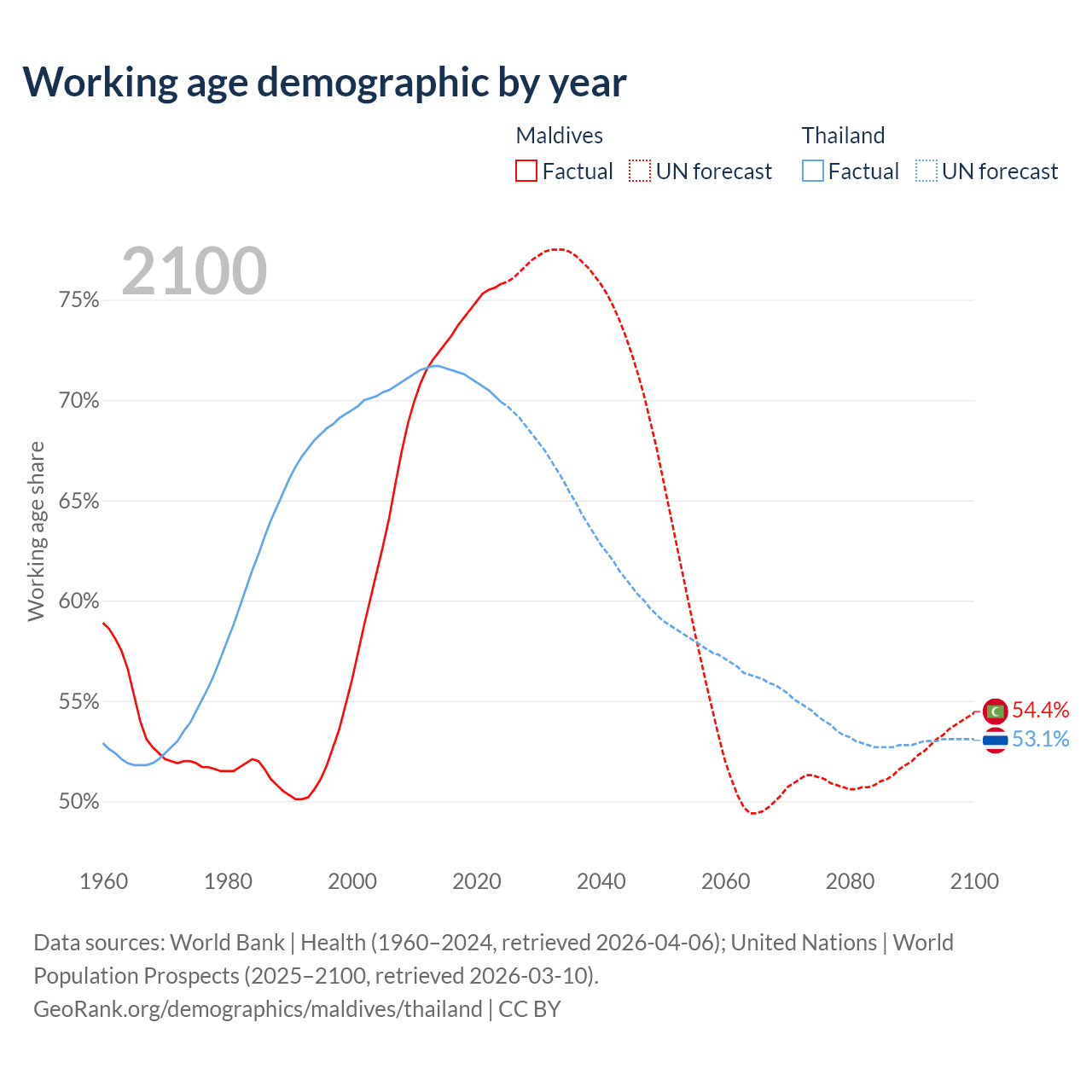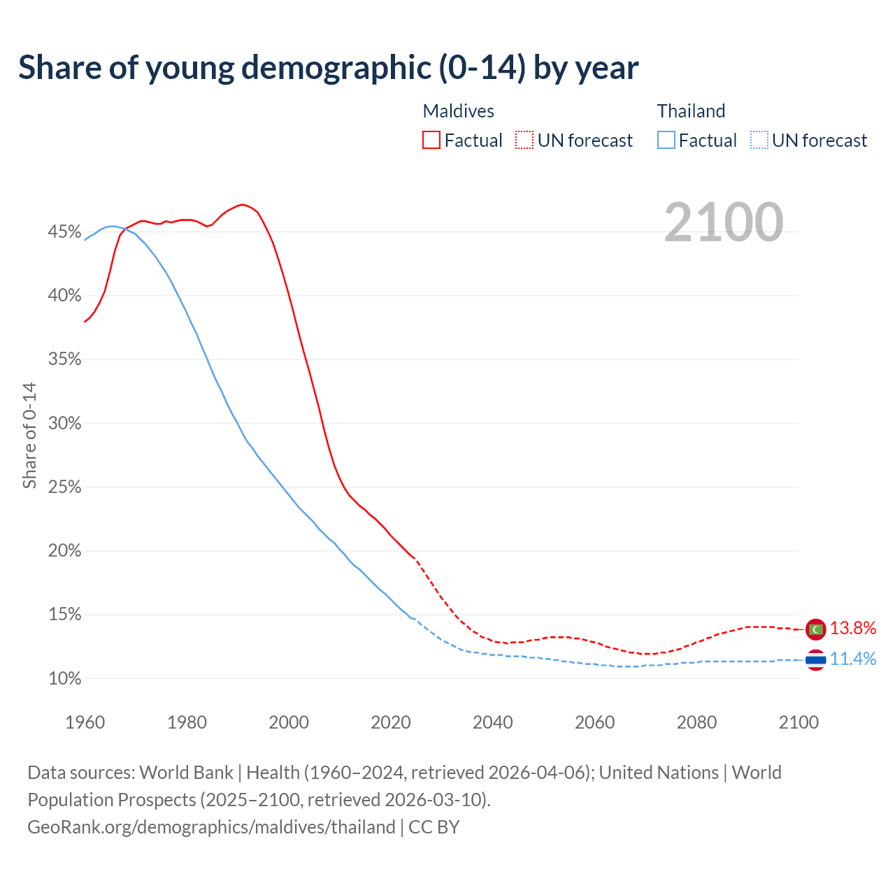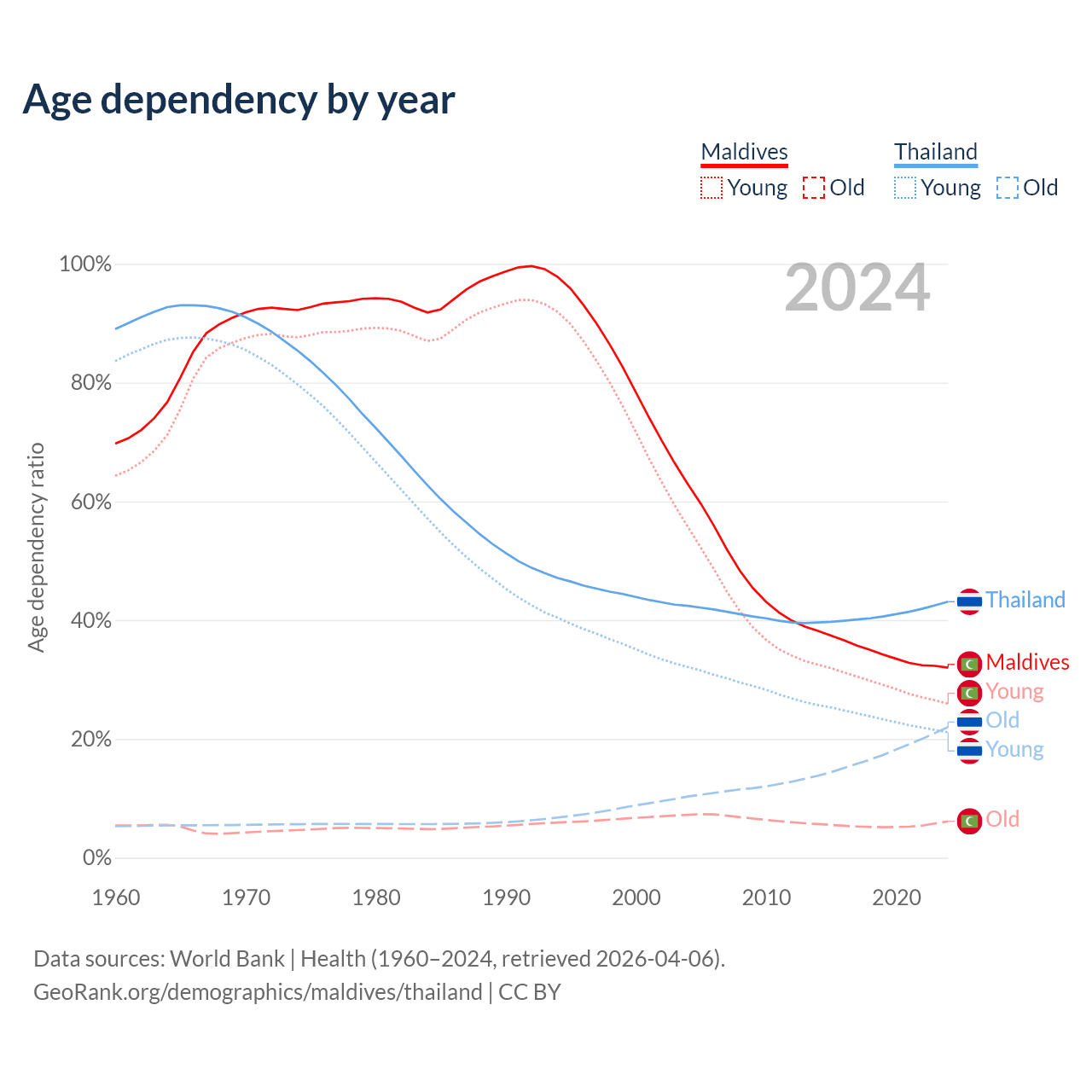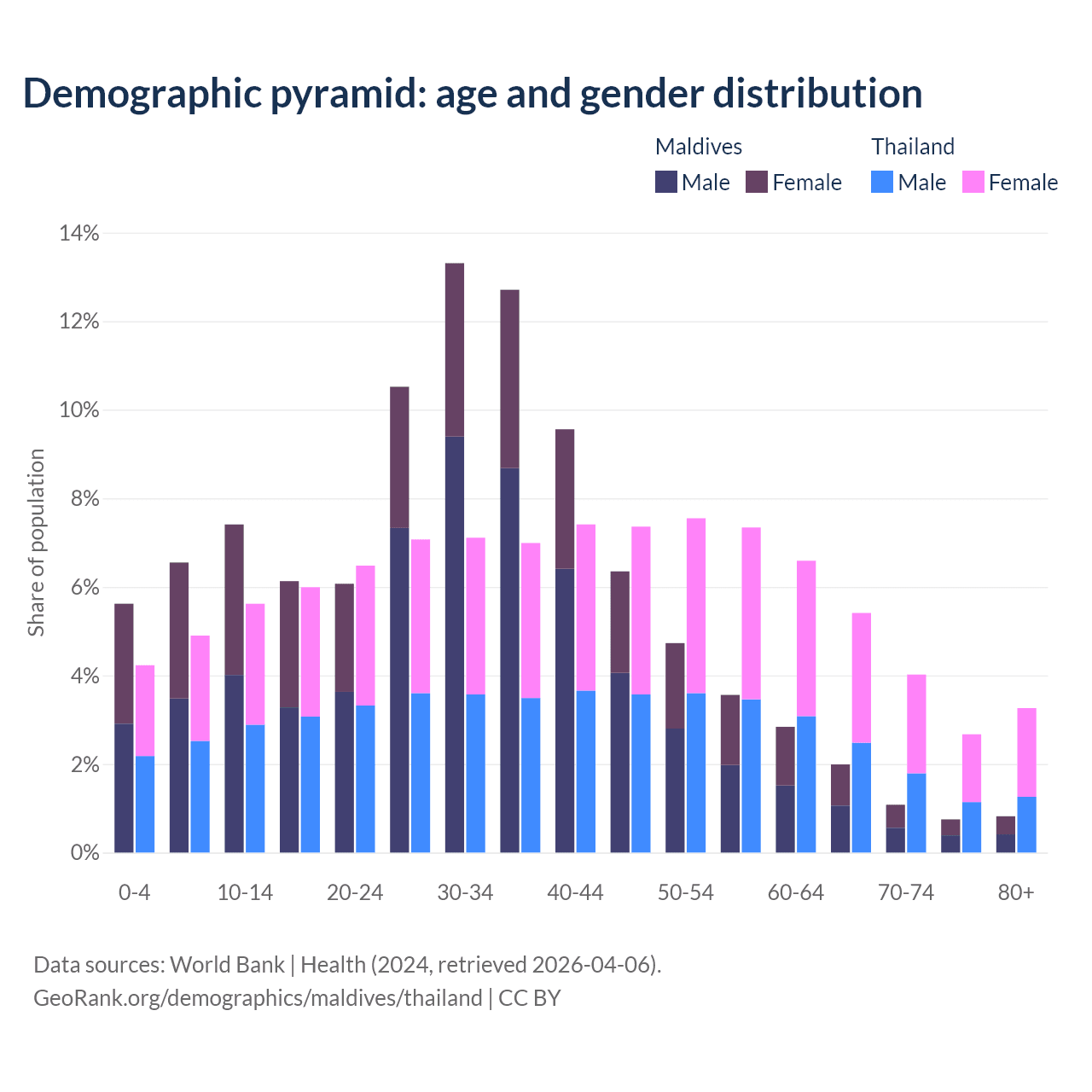 - Maldives is ranked 90/196 by median age (oldest to youngest) vs 40/196 for Thailand.