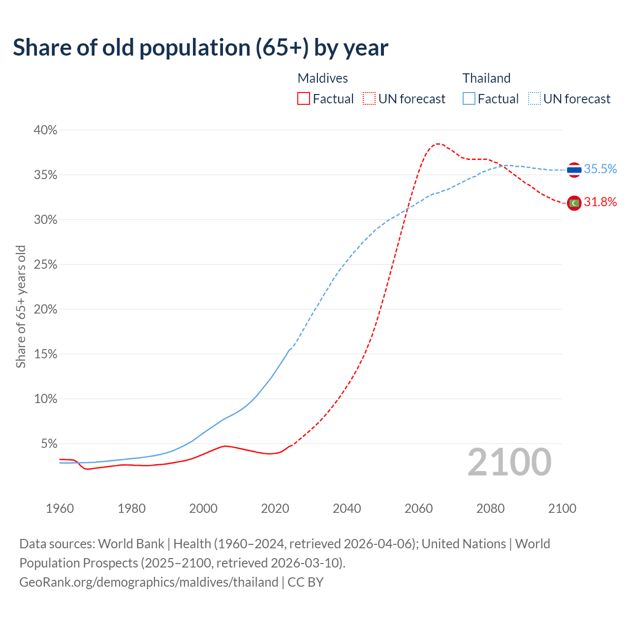 The share of older people aged 65 and over is 4.64% in Maldives and 15.4% in Thailand. Life expectancy in Maldives compared to Thailand .