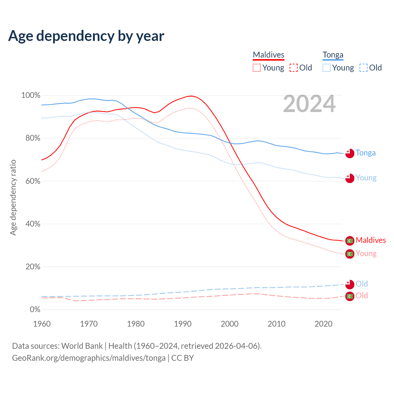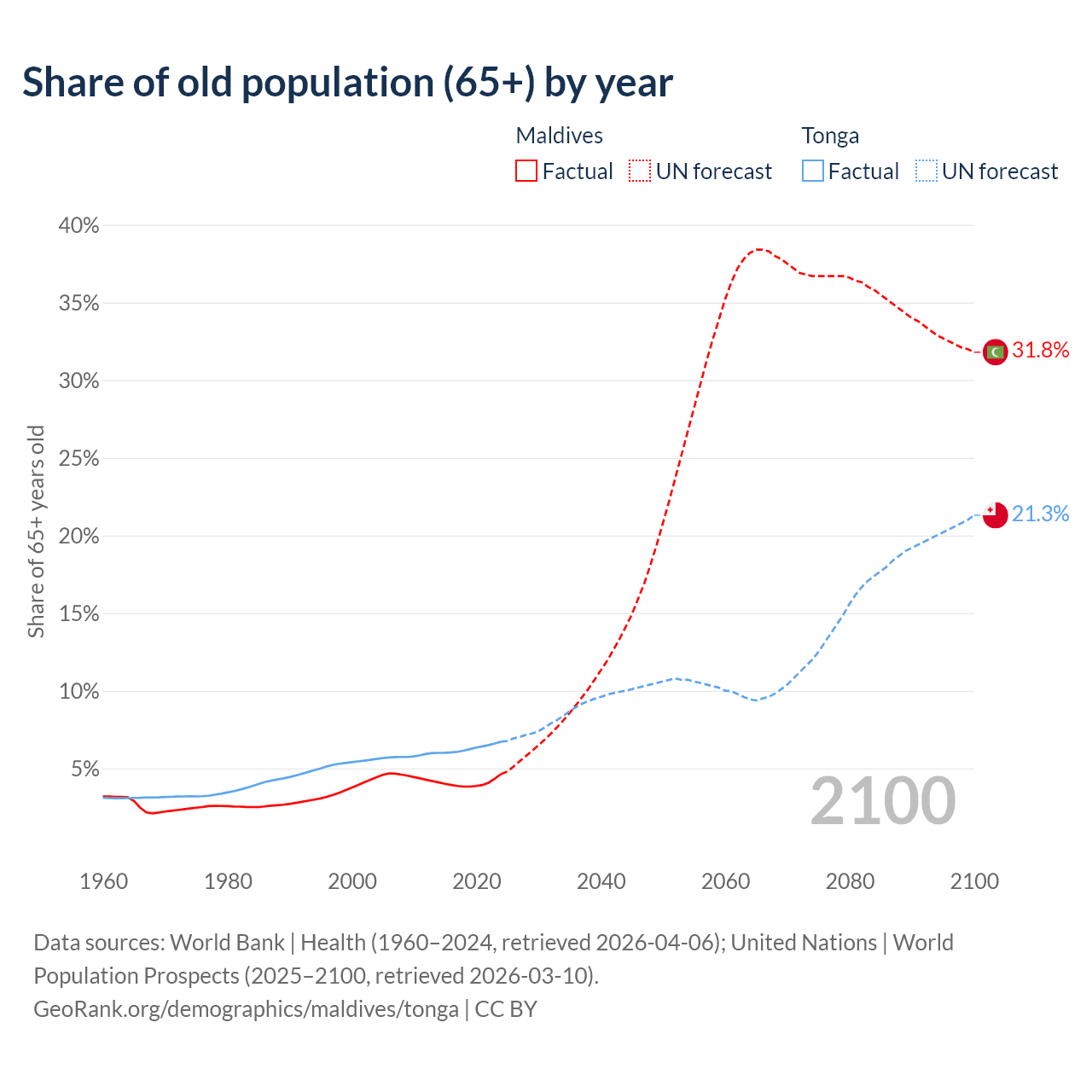 - The share of old-age demographic (65+) in Maldives is 4.64% vs 6.72% in Tonga.