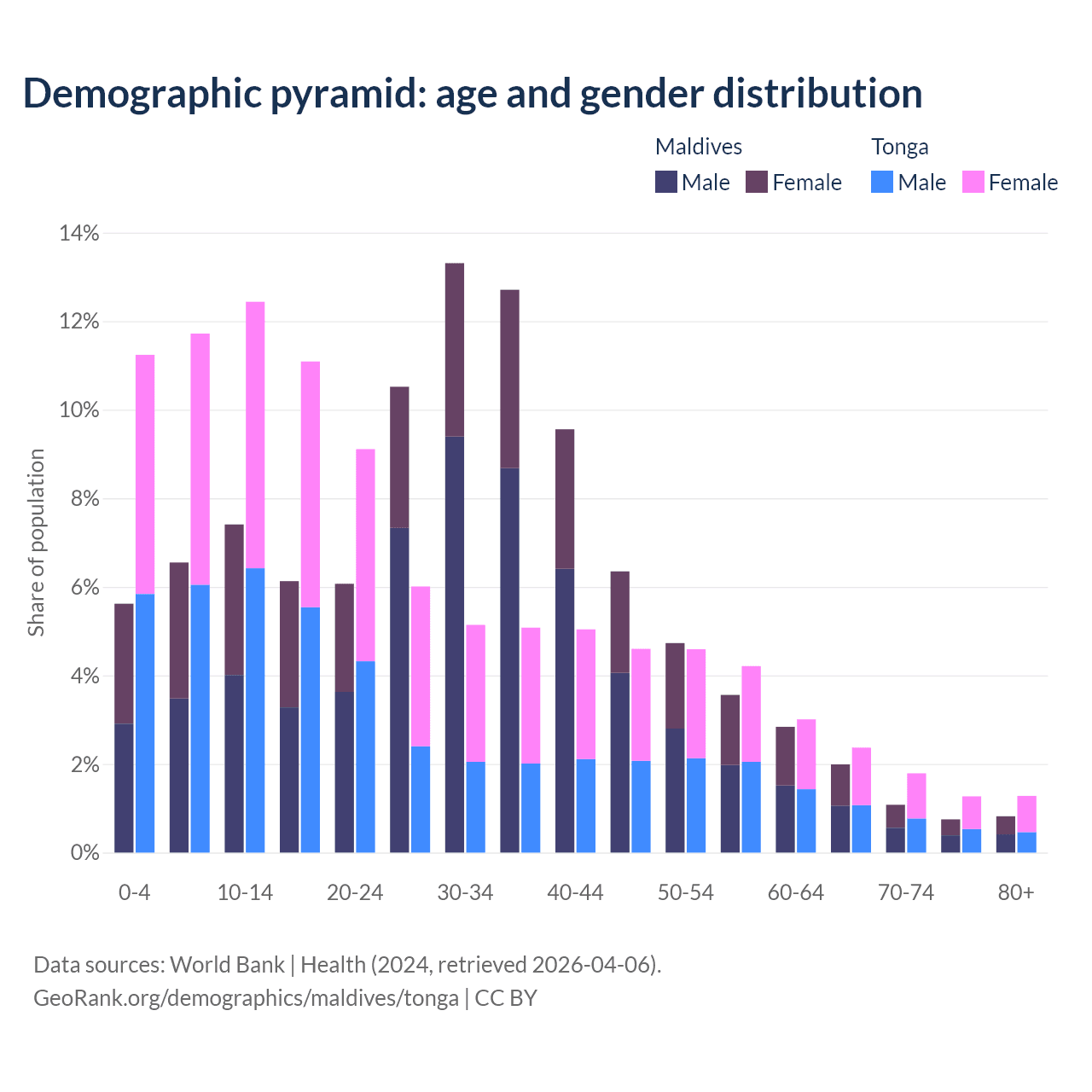 - Maldives is ranked 90/196 by median age (oldest to youngest) vs 149/196 for Tonga.