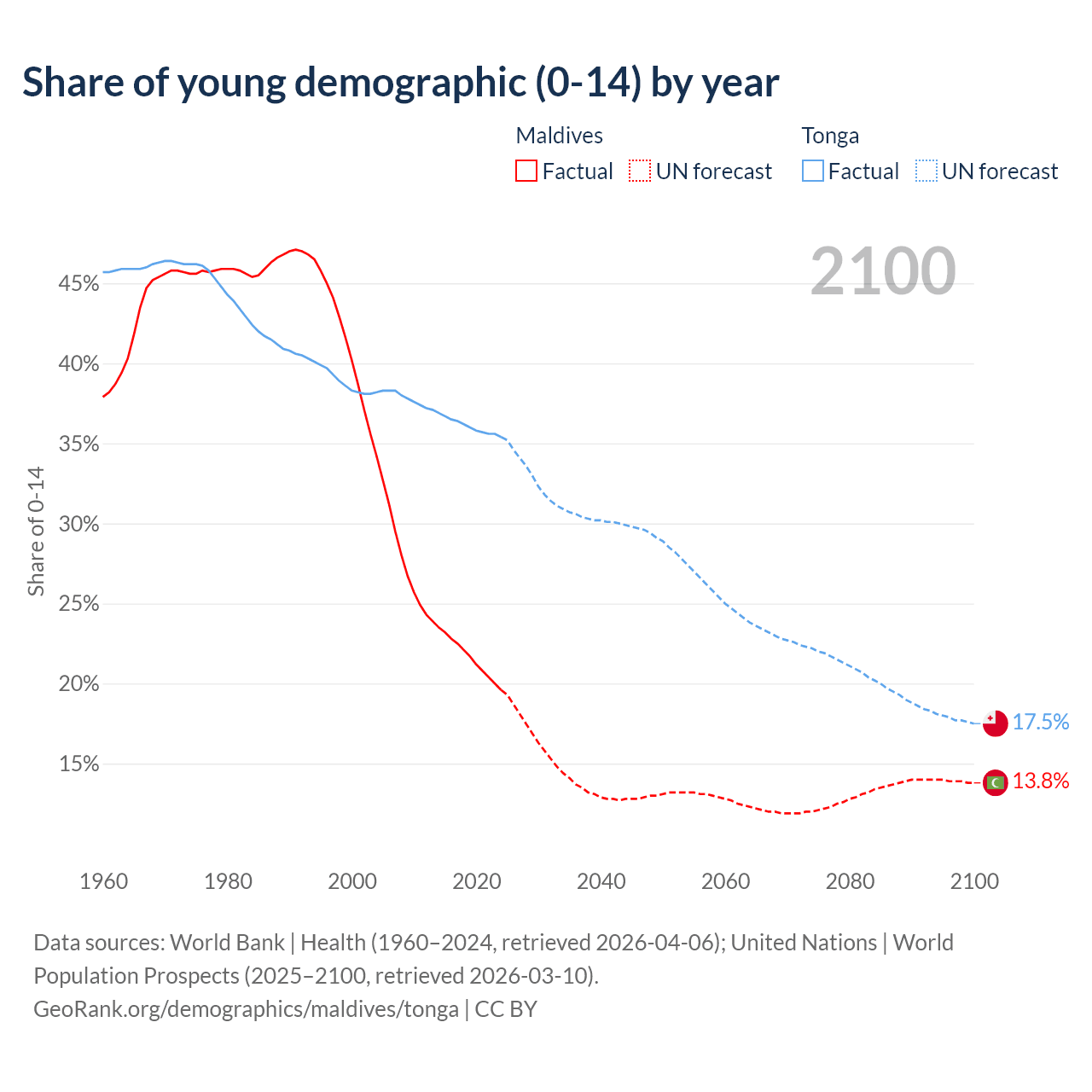 - The share of young demographic (0-15 years old) in Maldives is 19.6% vs 35.4% in Tonga.