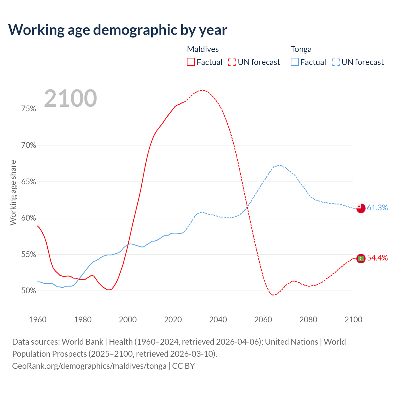 - Maldives has 403K working age adults (aged 15-64) vs 59.8K in Tonga.