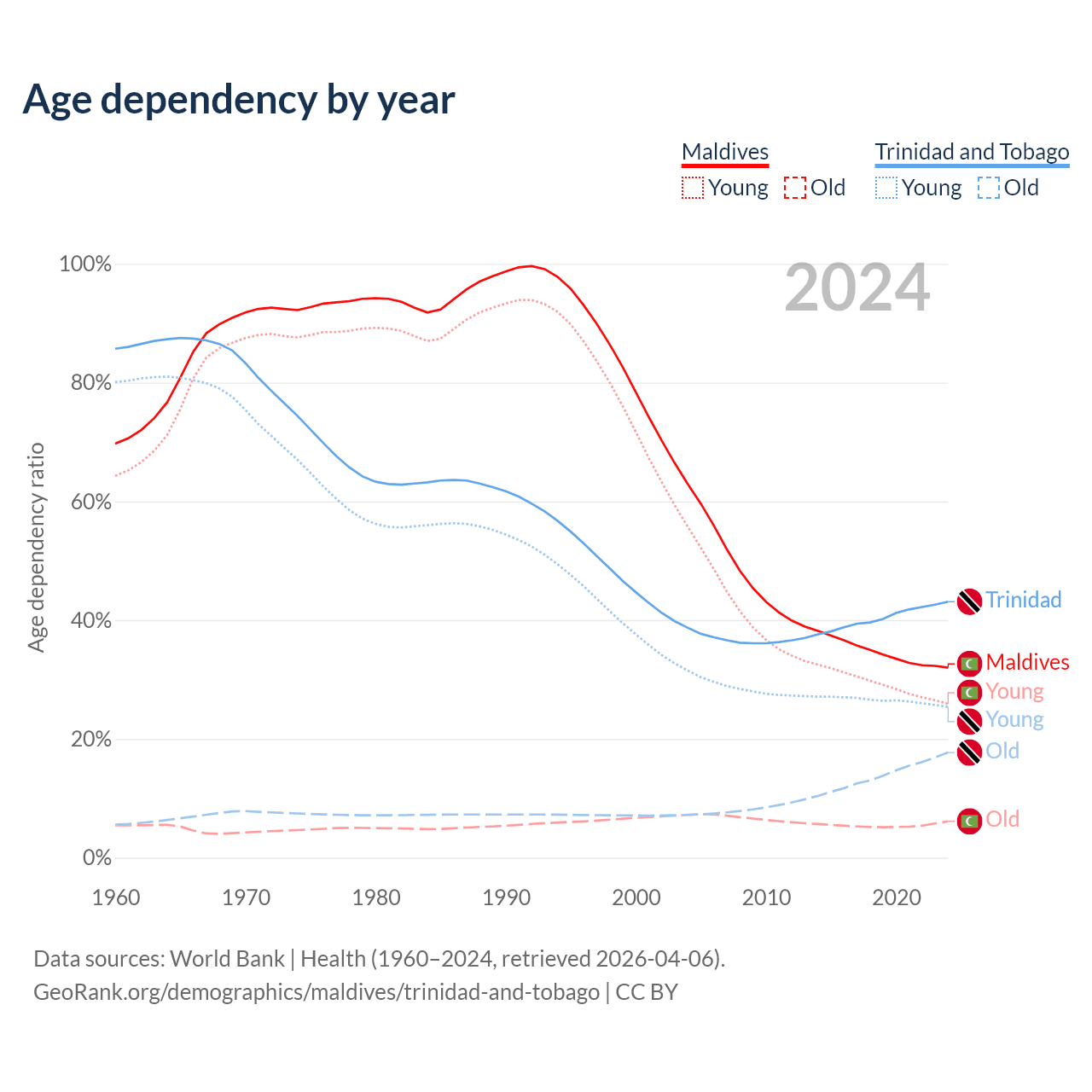 Data sources: World Bank | Health (1960–2024, retrieved 2026-04-06); U.S. Census Bureau (1960–2024, retrieved 2026-02-08).