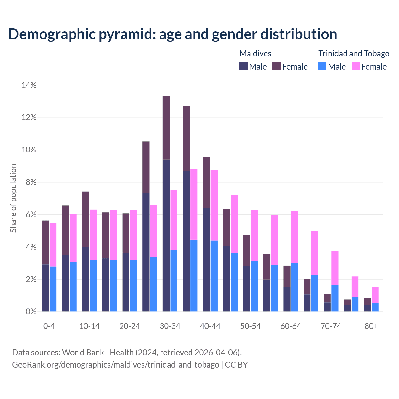 - Maldives is ranked 90/196 by median age (oldest to youngest) vs 58/196 for Trinidad and Tobago.