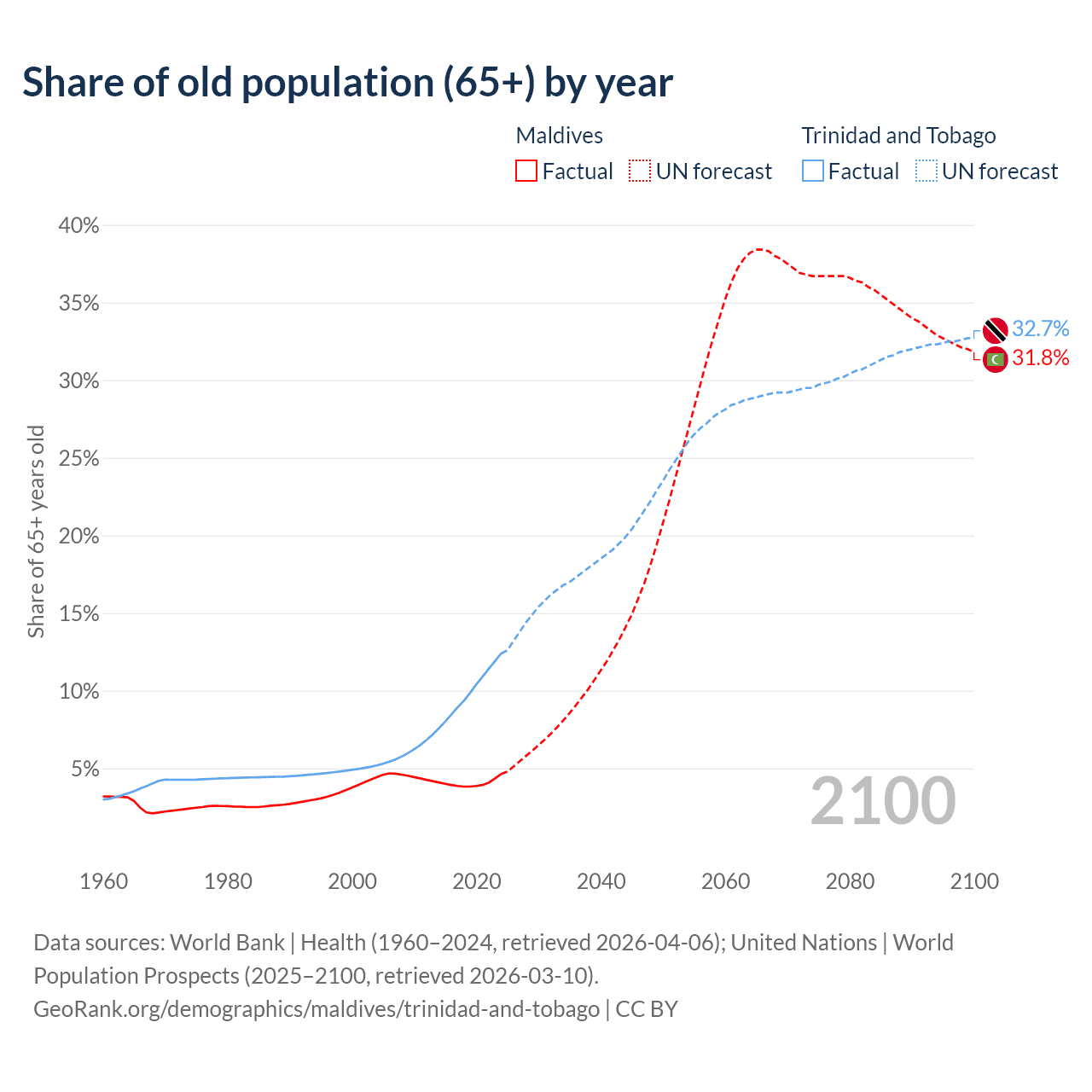 The share of older people aged 65 and over is 4.64% in Maldives and 12.4% in Trinidad and Tobago. Life expectancy in Maldives compared to Trinidad and Tobago .